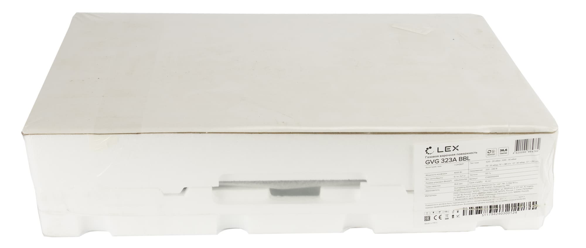 Варочная панель поставляется в упаковке из двух пенопластовых ложементов, надежно зафиксированных прочной пленкой. На одной из боковых сторон размещена наклейка с данными о приборе.