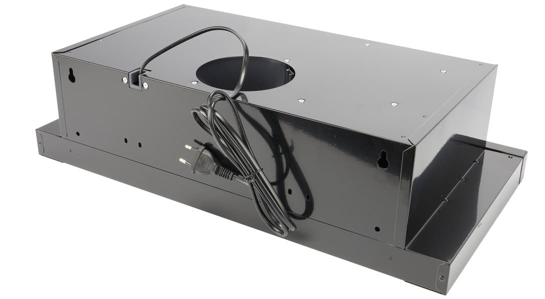 Еще на этапе распаковки мы определили, что перед нами — самая обычная, мы бы даже сказали, классическая встраиваемая телескопическая вытяжка. Правда, корпус у этой модели не «технический», а окрашен черной краской. Сам разработчик при этом указывает на возможность установки вытяжки без встраивания, в настенном формате. Таким образом, вытяжку можно смонтировать и так и этак — либо встраивая ее в кухонный гарнитур, либо просто повесив на стену. В обоих случаях к пользователю устройство будет обращено нижней стороной.
