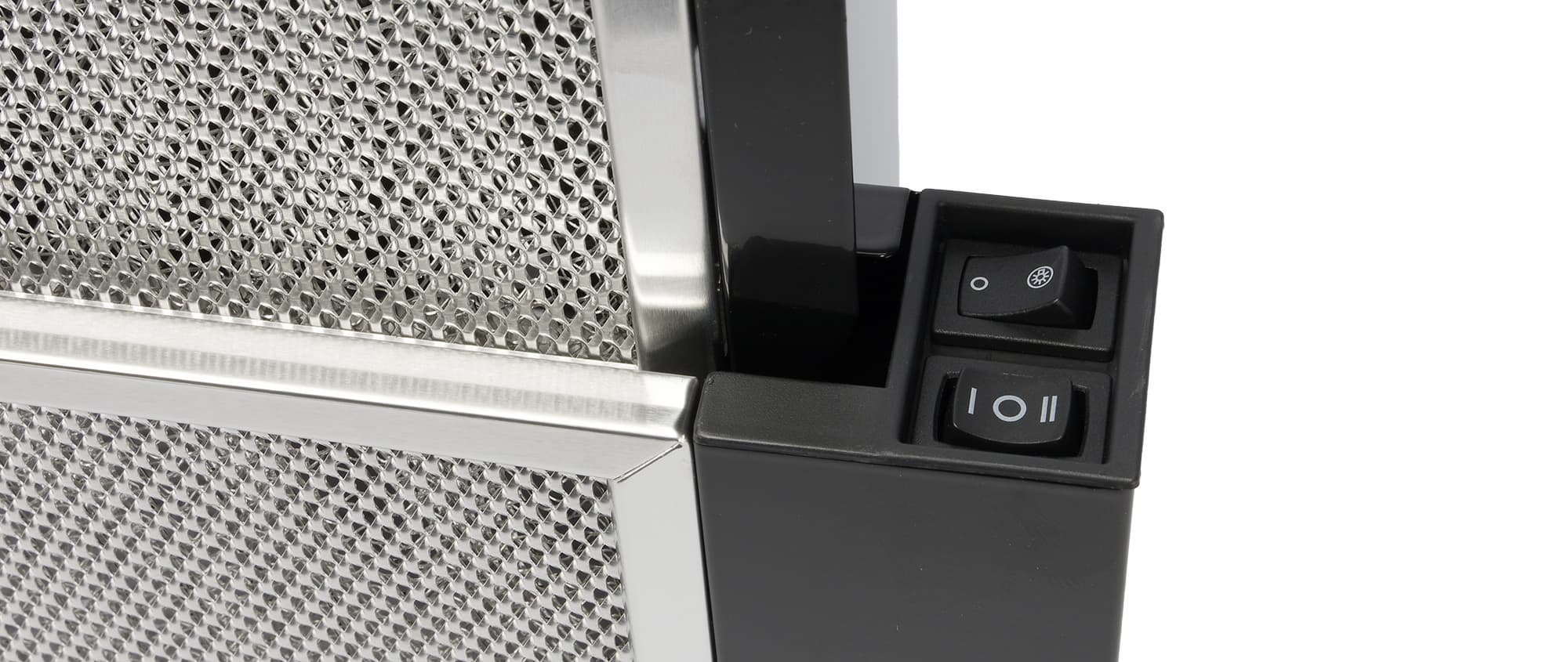Нижний, трехпозиционный, позволяет выключить вытяжку либо выбрать режим мощности — «1» и «2». Если выключатель находится в центральном положении, прибор выключен.