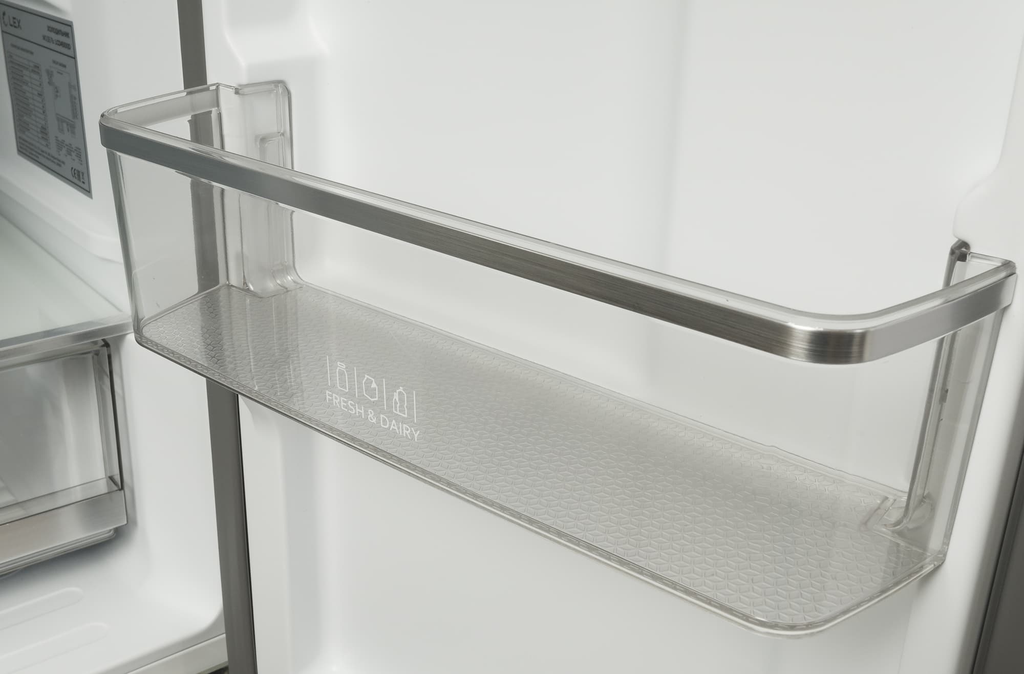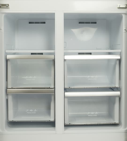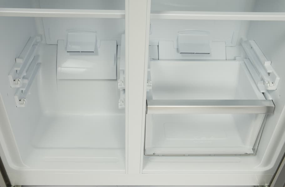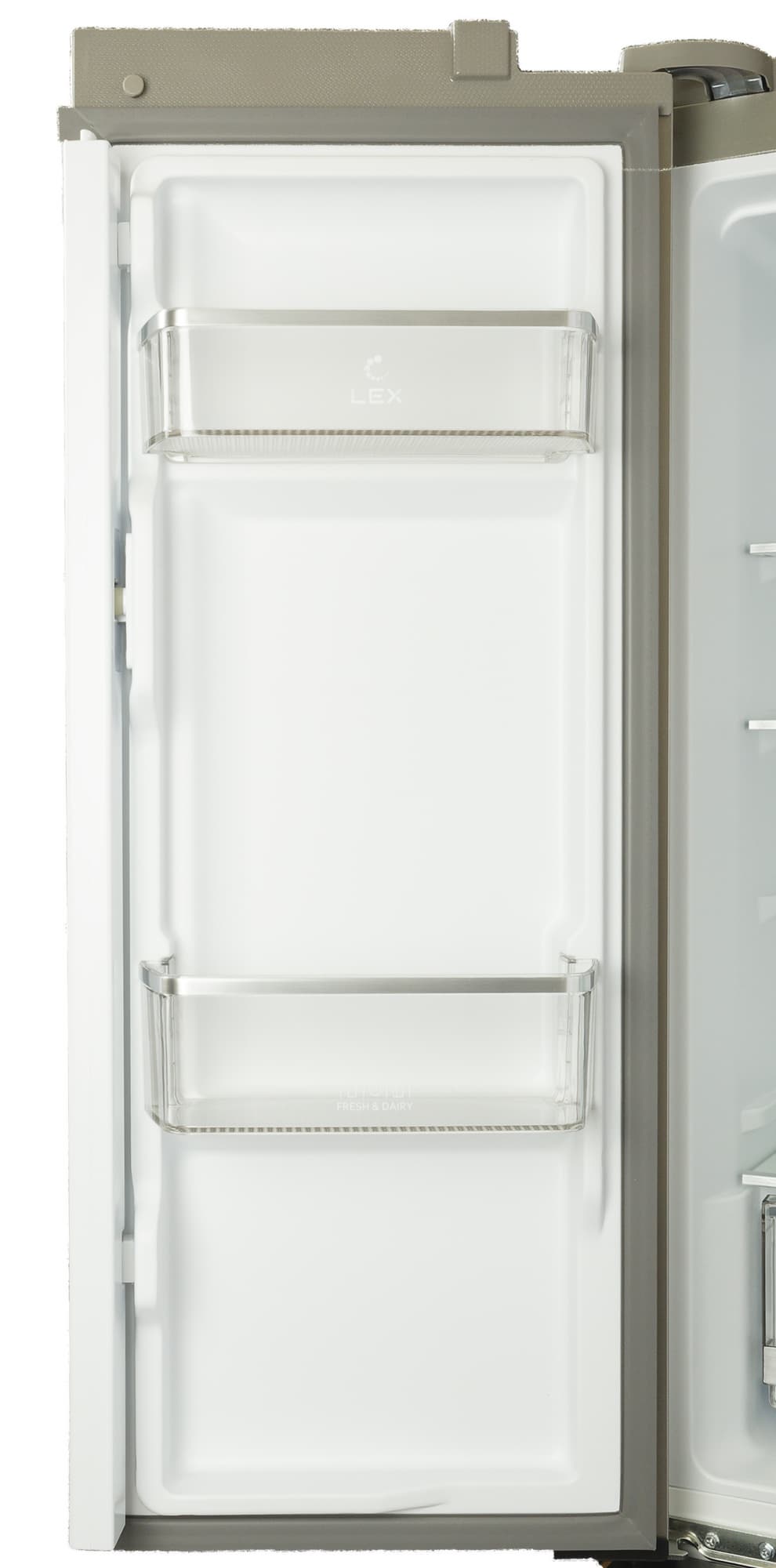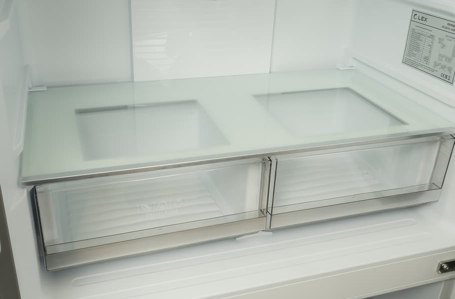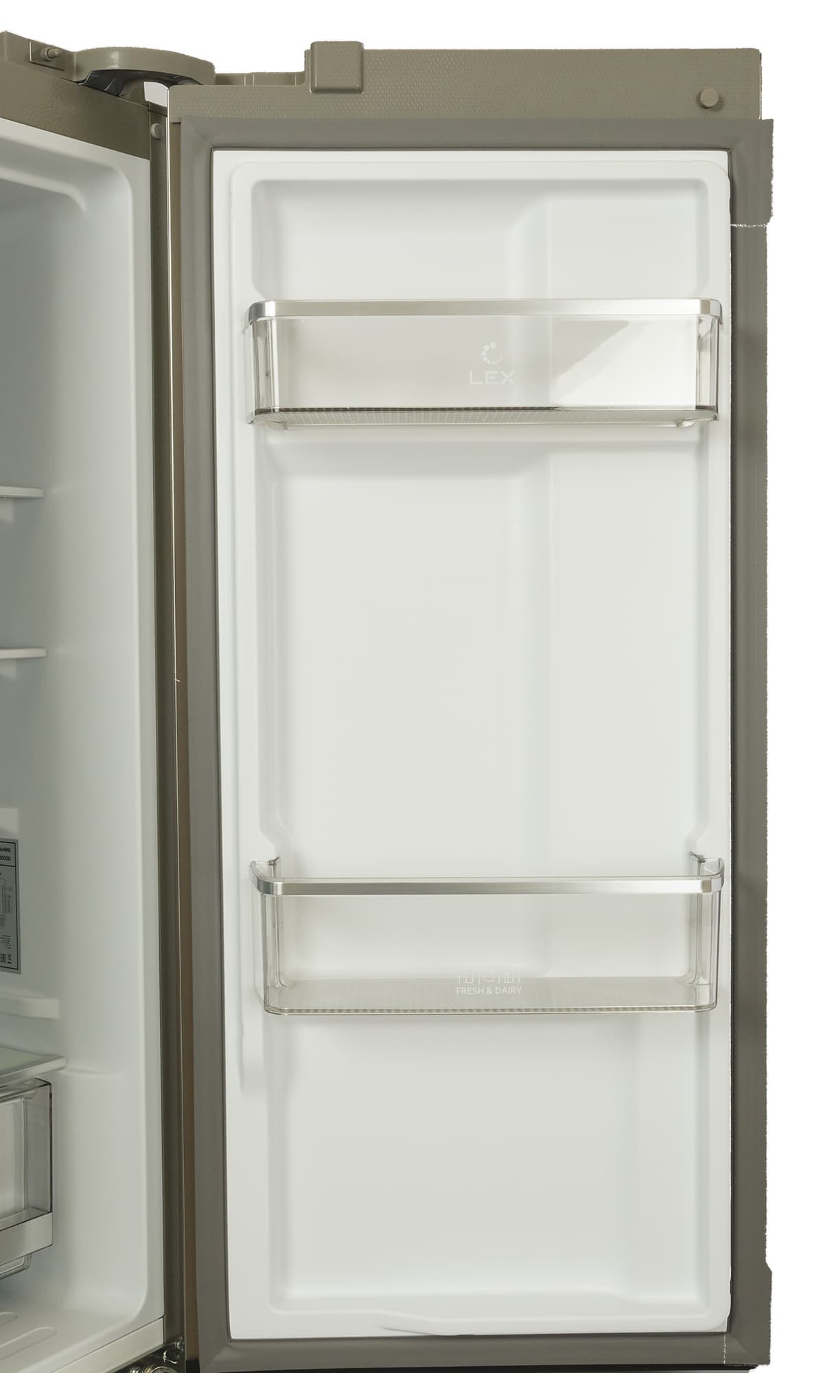 Перейдем к внутреннему устройству прибора. У Lex LCD450XID две камеры, которые закрыты четырьмя дверцами: левая пара чуть поуже, правая — пошире. Холодильная камера находится сверху, морозильная — под ней.