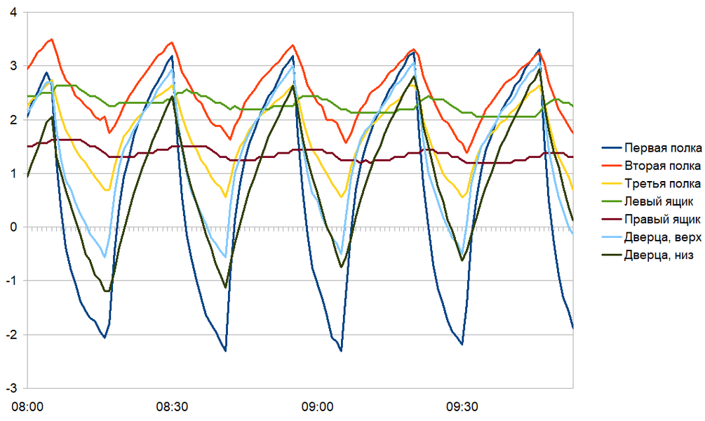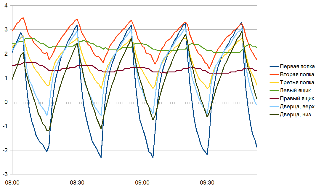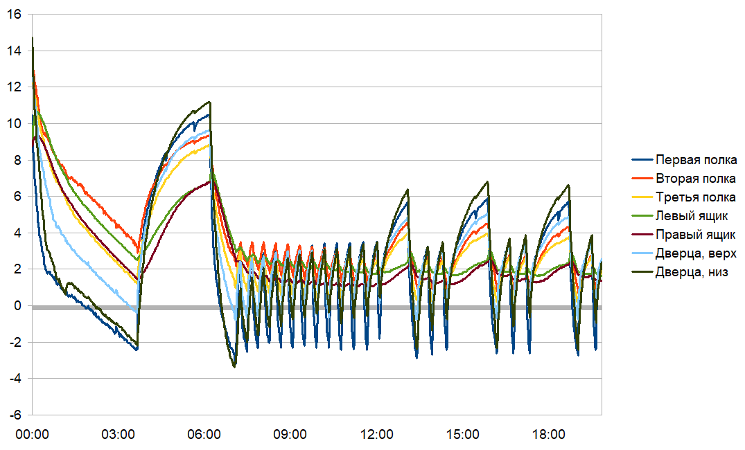 Считаем необходимым еще раз подчеркнуть, что приведенные графики иллюстрируют не потребительские качества холодильника, а особенности логики работы холодильного агрегата и циркуляции холодного воздуха между зонами камеры. Не следует удивляться таким, на первый взгляд, существенным колебаниям: охлажденные продукты обладают значительно большей тепловой инерцией, нежели воздух в камере, и переносят циклические изменения температуры нормально.