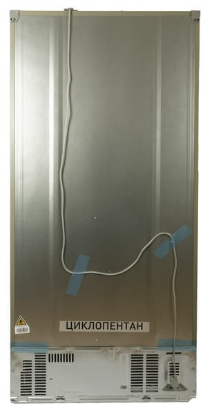 Алюминиевая задняя стенка гладкая: теплообменники у этой модели убраны внутрь корпуса. В нижней части видна ниша холодильного агрегата, закрытая стальной крышкой с вентиляционными отверстиями.