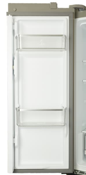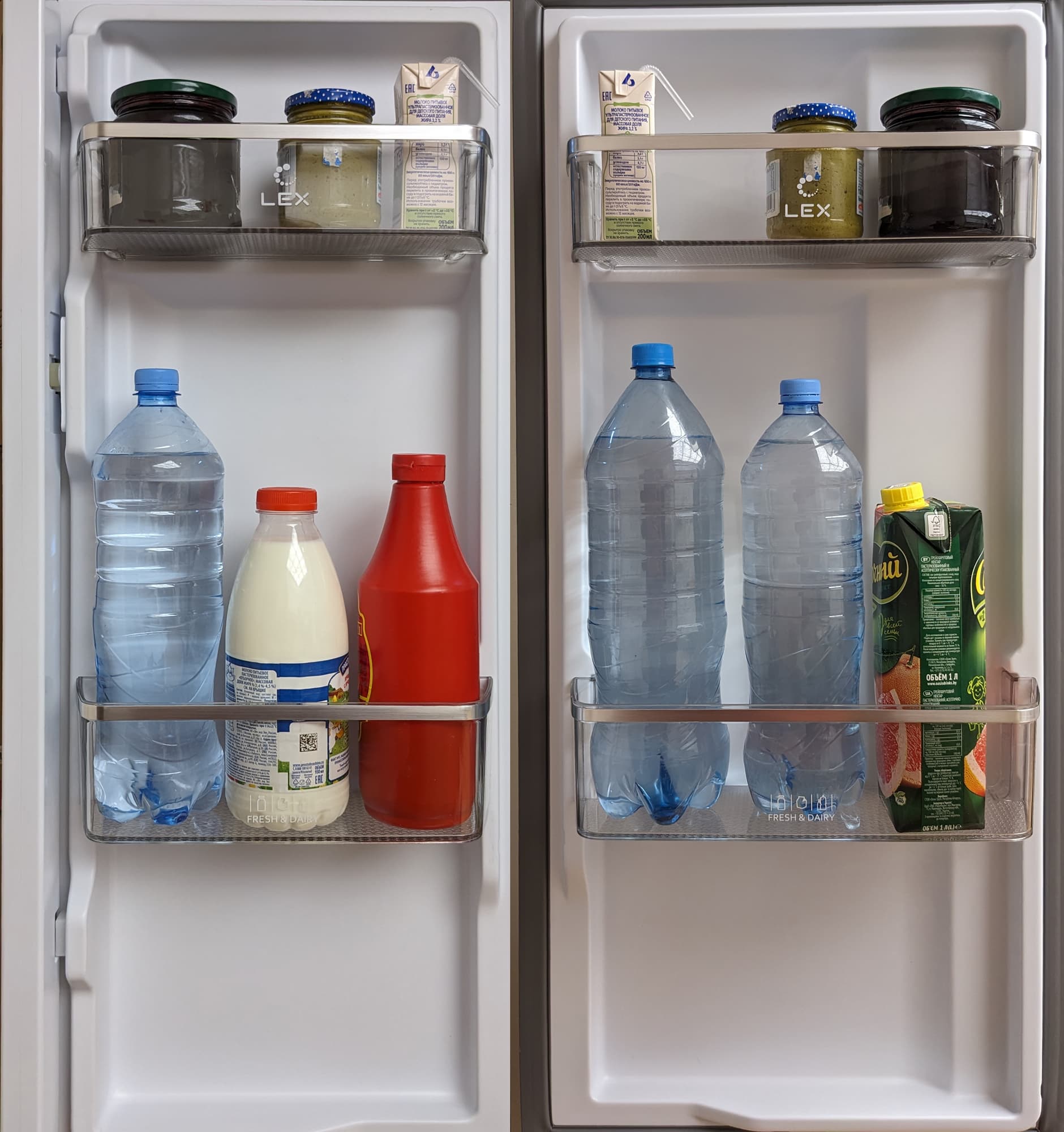 Хотя дверцы слегка различаются по ширине, возможности для хранения в них практически одинаковые. На нижние полки можно поставить бутылки объемом до 2 литров, а верхние подойдут для не слишком объемных предметов: контейнеров для яиц, маленьких пакетов со сливками, небольших коробок и банок. Возможности изменять положение полок нет и здесь.