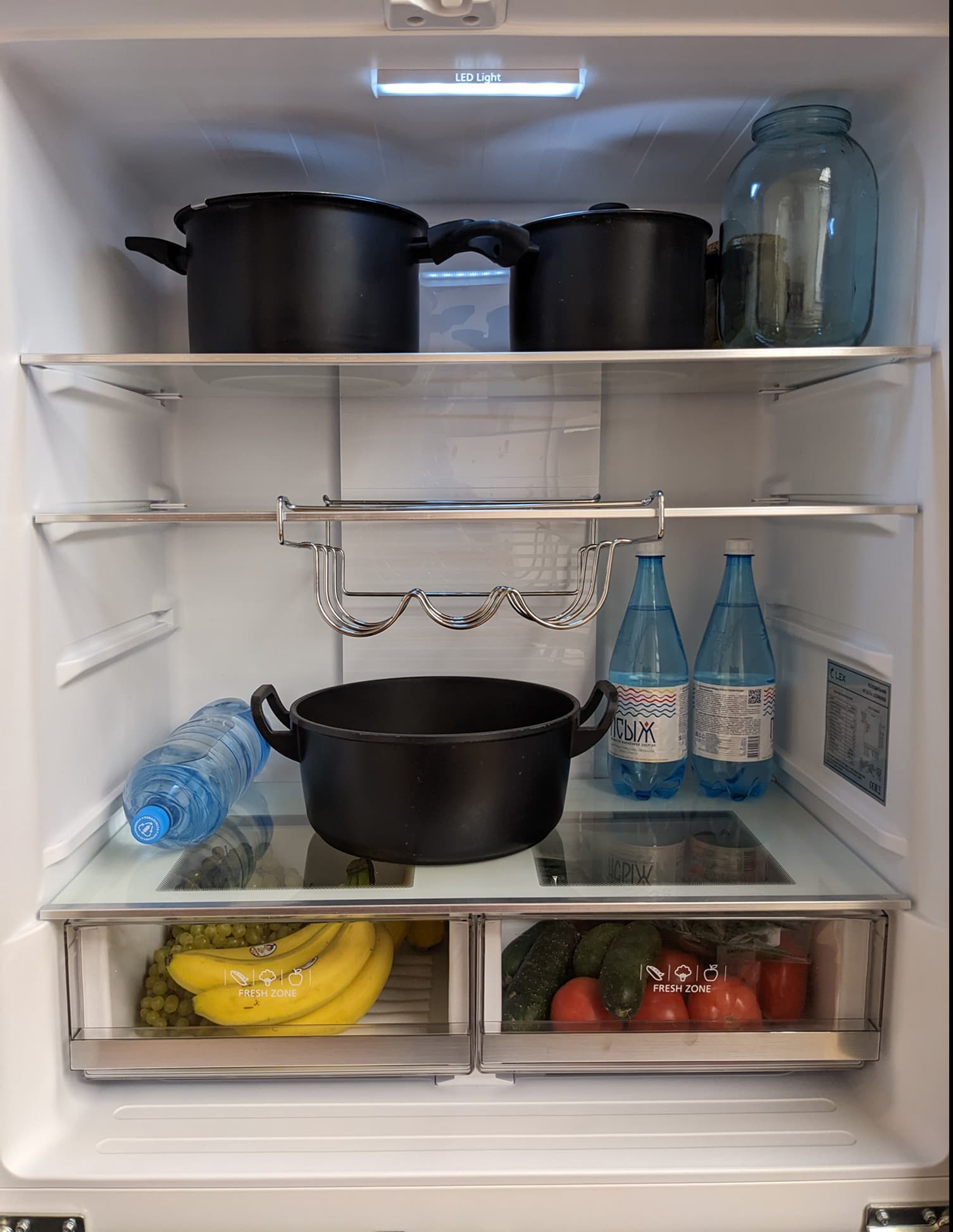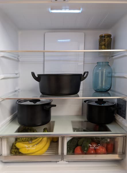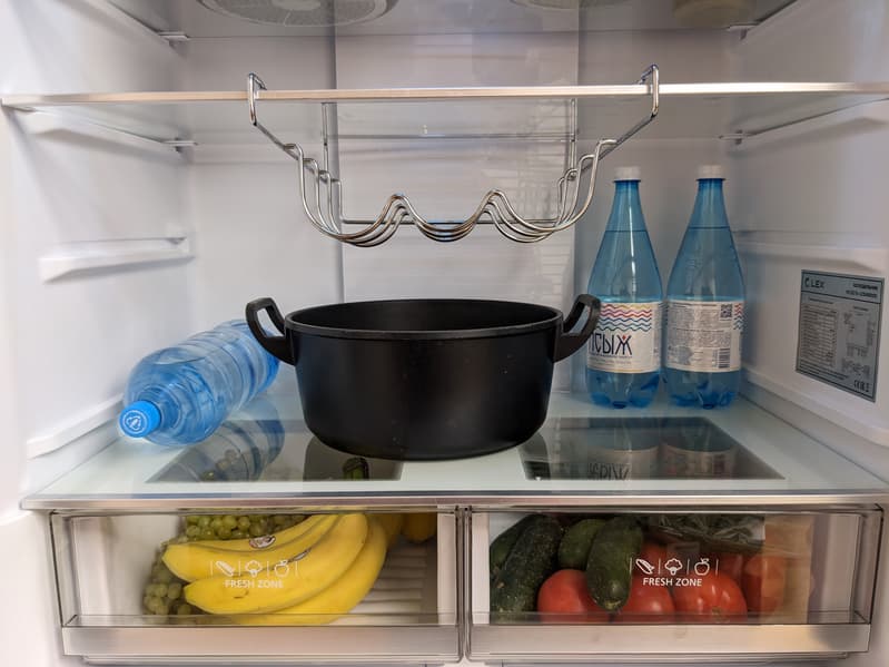 Как и во всех предыдущих обзорах, мы не только измеряем емкость холодильной камеры линейкой и рулеткой, но и демонстрируем ее вместительность на более наглядных примерах.