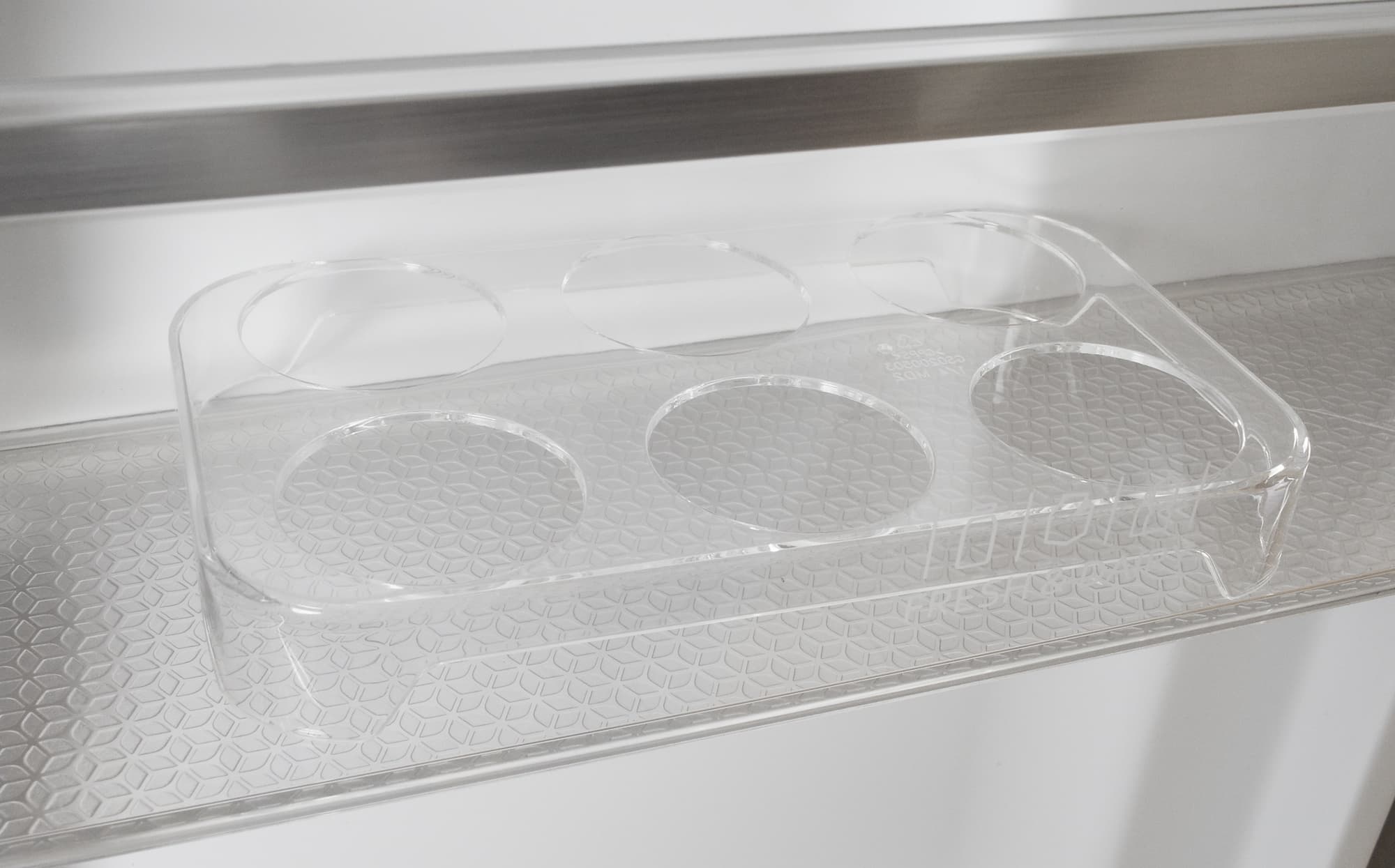 Полки из прозрачного пластика переставить нельзя, у них фиксированное положение.