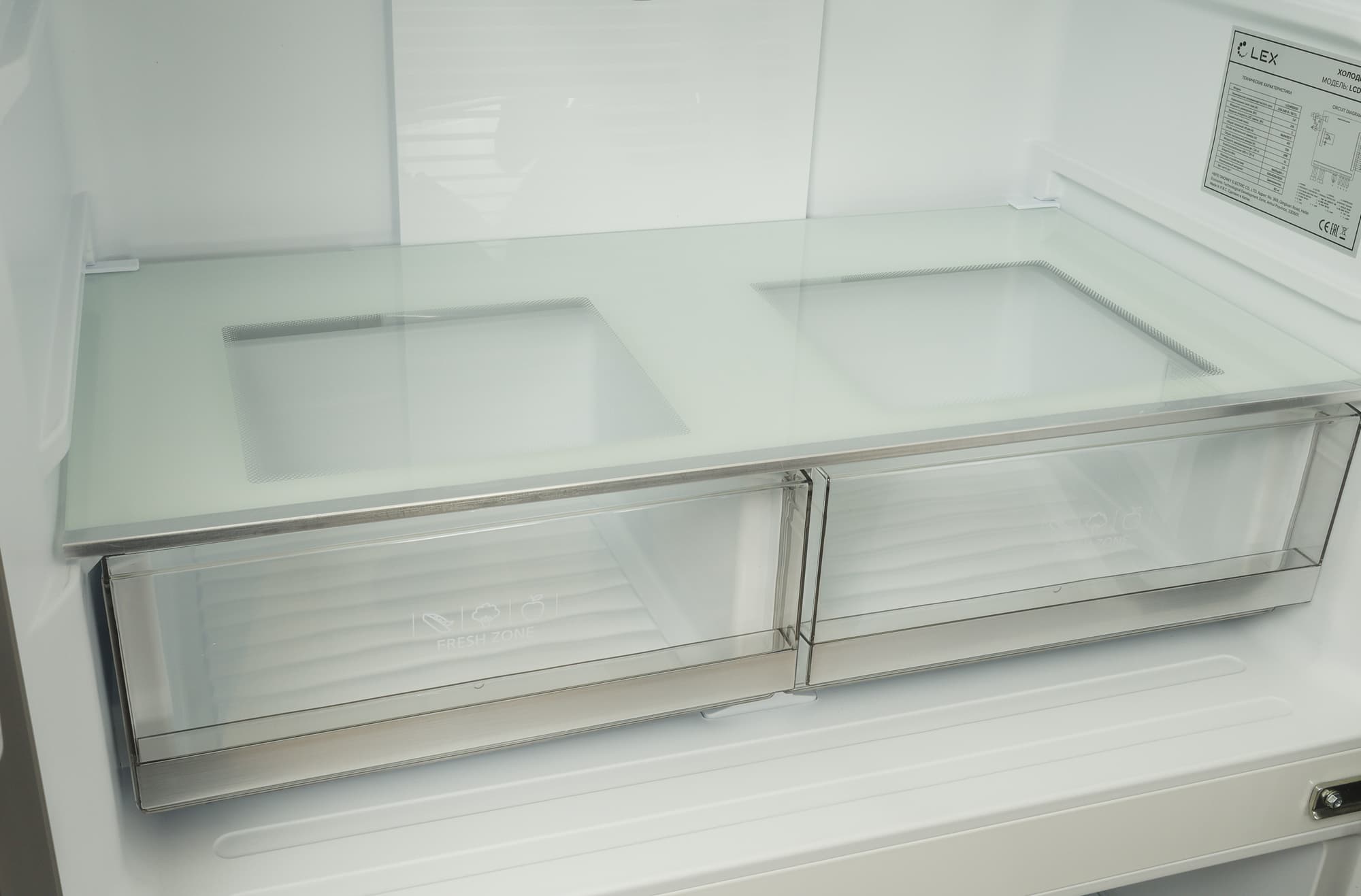 Окрашенная стеклянная крышка зоны свежести (она же — нижняя полка) снабжена «окнами», позволяющими видеть содержимое ящиков.
