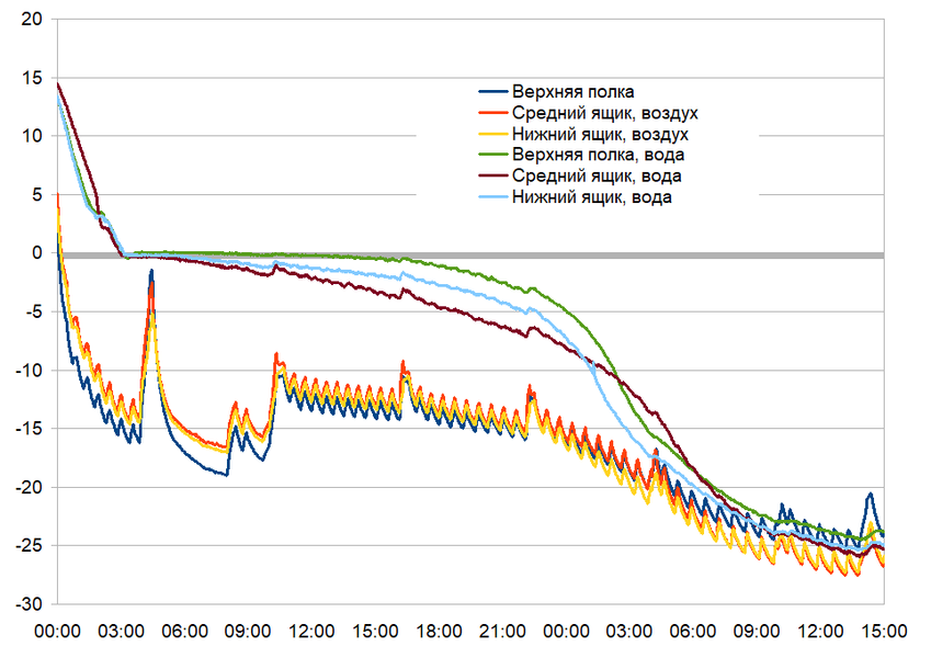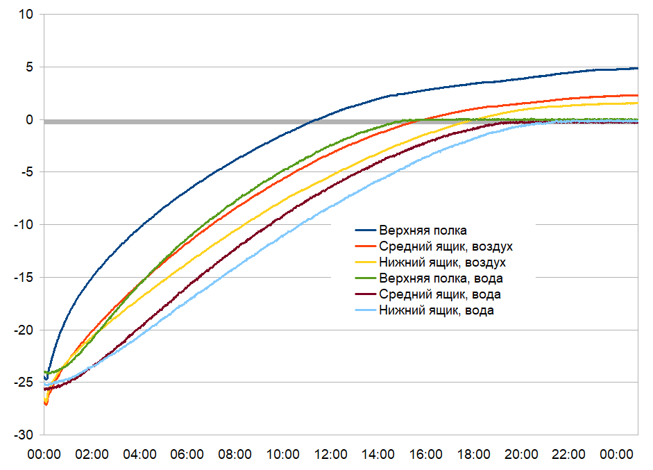 Вода в среднем и нижнем ящиках замерзла почти одновременно — приблизительно через 6 часов. Признаки замерзания на верхней полке — в относительно более теплой зоне — мы видим через 16 часов с начала теста. После этого температура льда продолжила снижаться, достигнув установленной минимальной температуры через 37 часов с начала теста.
