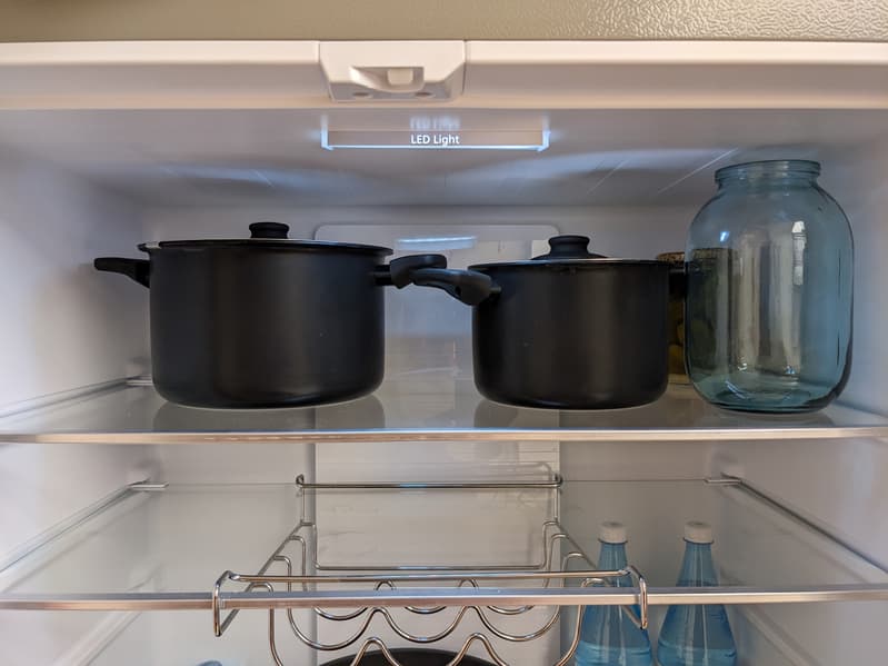 Высота верхней полки позволяет поставить на нее стандартную стеклянную банку емкостью до двух литров. А вот для трехлитровой придется либо поискать место на одной из нижних полок, либо переставить верхнюю.