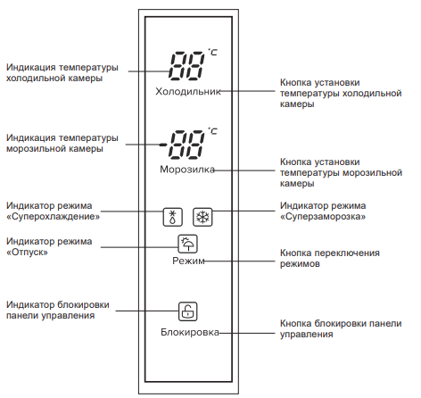 Панель управления представляет собой прямоугольный дисплей из темного пластика. В верхней его части расположены светодиодные индикаторы установленной температуры для холодильной и морозильной камер.