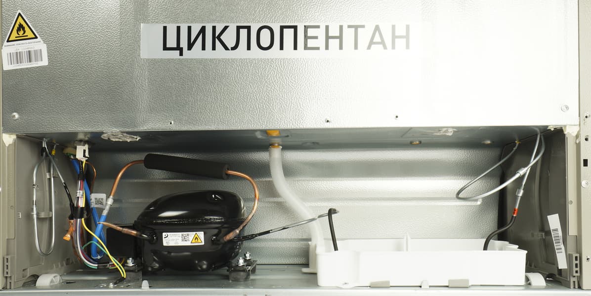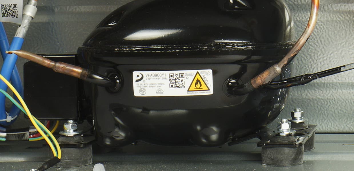 Здесь использован бесщеточный компрессор VFA090CY1 производства Donper Group. Как и полагается, он закреплен на четырех болтах, снабженных резиновыми амортизаторами, которые поглощают вибрацию и снижают шум.