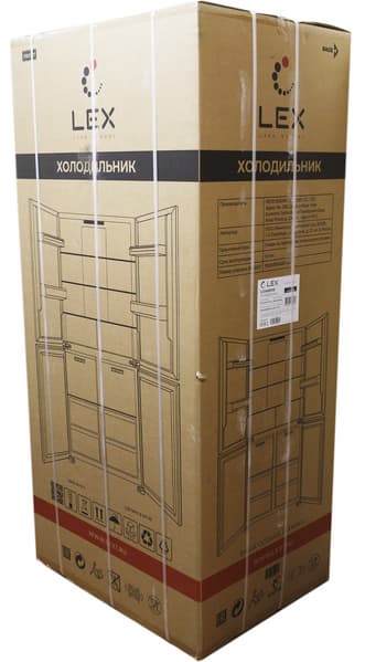 Холодильник приехал к нам на тестирование в упаковке из картона и пенопласта, усиленной капроновыми стропами. Передняя сторона коробки украшена изображением устройства с распахнутыми дверцами, а на боковых стенках можно ознакомиться с краткими техническими характеристиками.