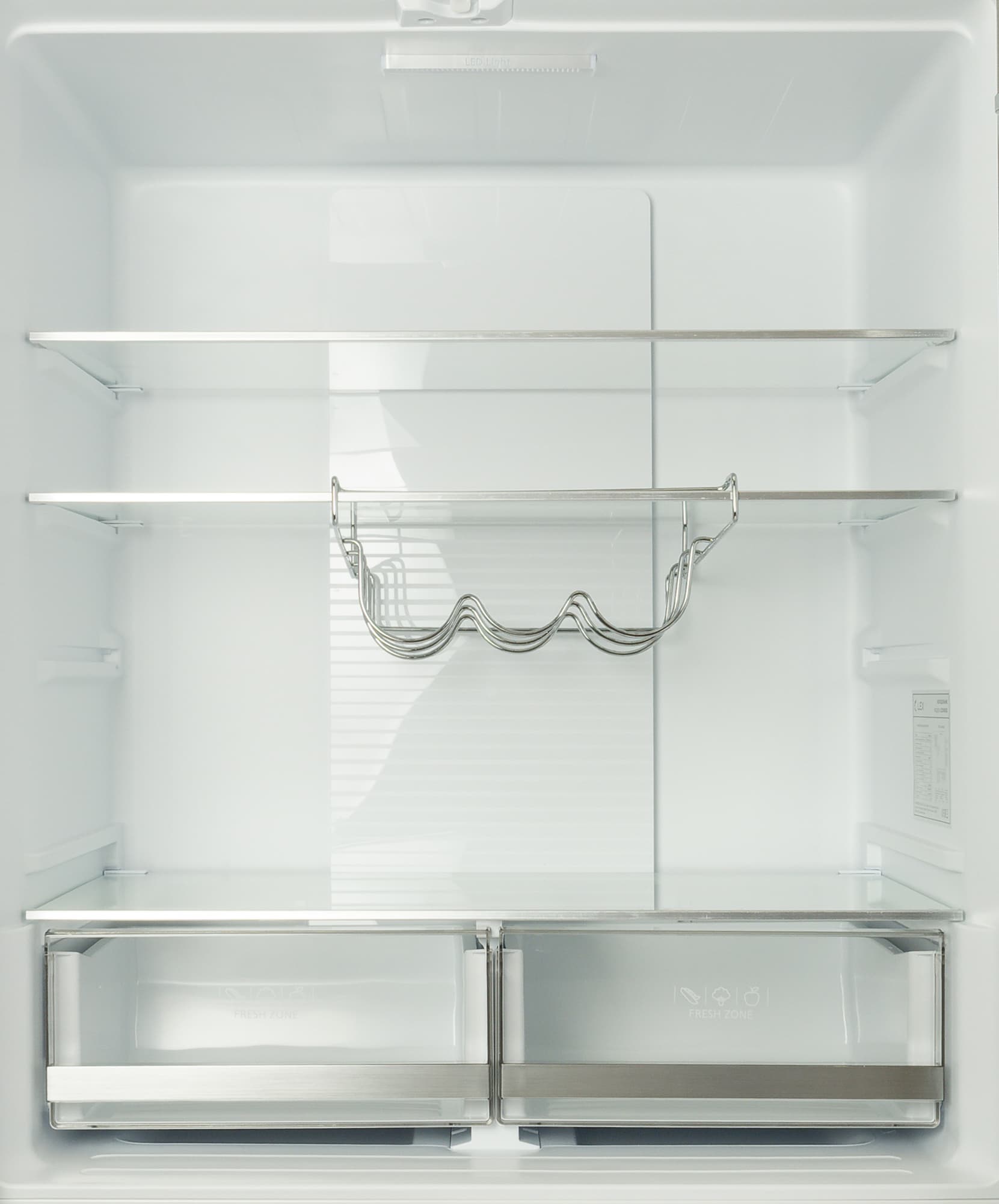 В холодильном отделении — две полки из закаленного стекла с декоративными алюминиевыми накладками. Роль третьей полки выполняет крышка зоны свежести.
