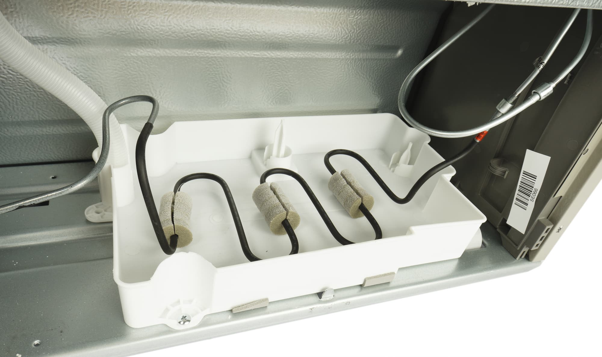 Конденсат, образующийся при работе системы No Frost в холодильном и морозильном отделениях, стекает по пластиковой трубке в испарительную ванночку. Чтобы там он скорее высыхал, через емкость проходит змеевик, нагревающий жидкость. Эта конструкция оборудована амортизаторами из пористого материала — посторонних звуков и вибрации не возникает.