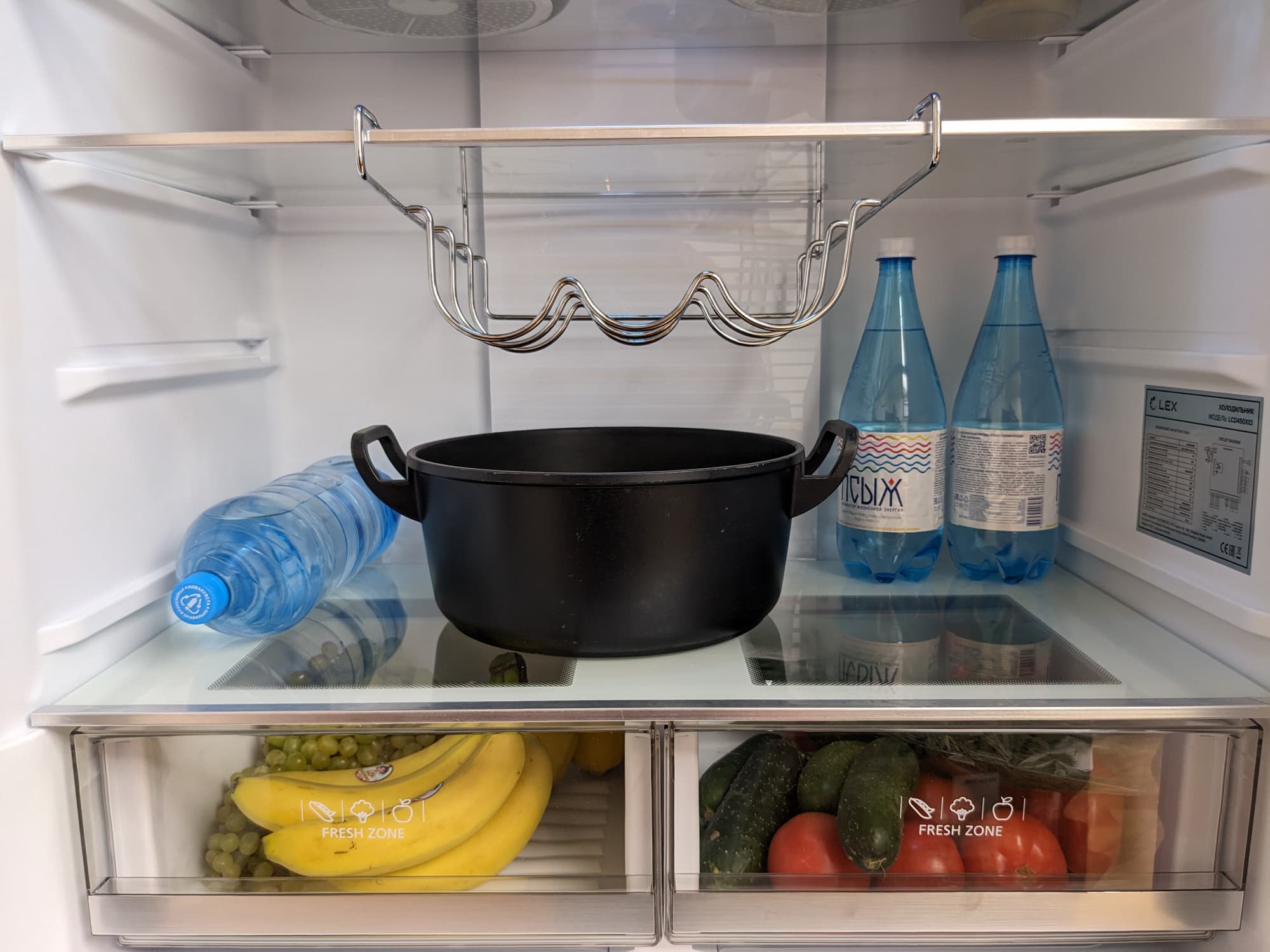 Широкая и просторная холодильная камера позволяет свободно разместить в ней самую крупную кухонную посуду: на ее полках могут свободно разместиться трех-, пяти- и даже восьмилитровые кастрюли.