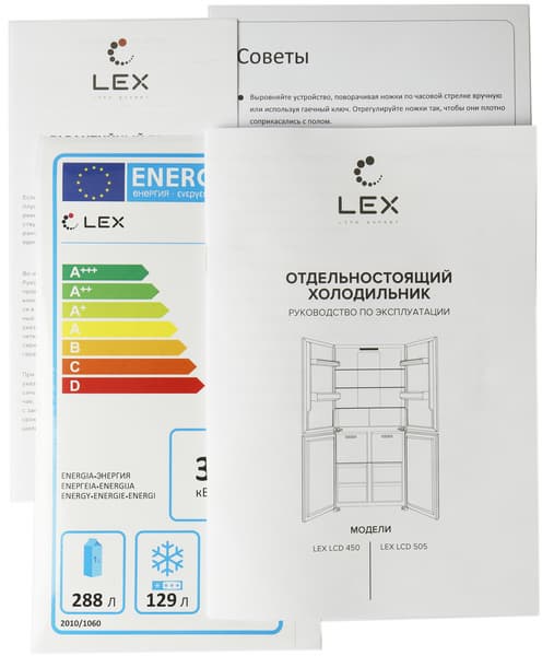 Как это часто бывает у производителей крупной бытовой техники, документ создан сразу для двух линеек холодильников, но моделезависимых отличий у них немного: наш Lex LCD450 отличается от более крупной модели LCD505 только размерами, чуть меньшим энергопотреблением и несущественно более долгим временем поддержания температуры при отключении электроэнергии (12 часов против 10 у LCD505).