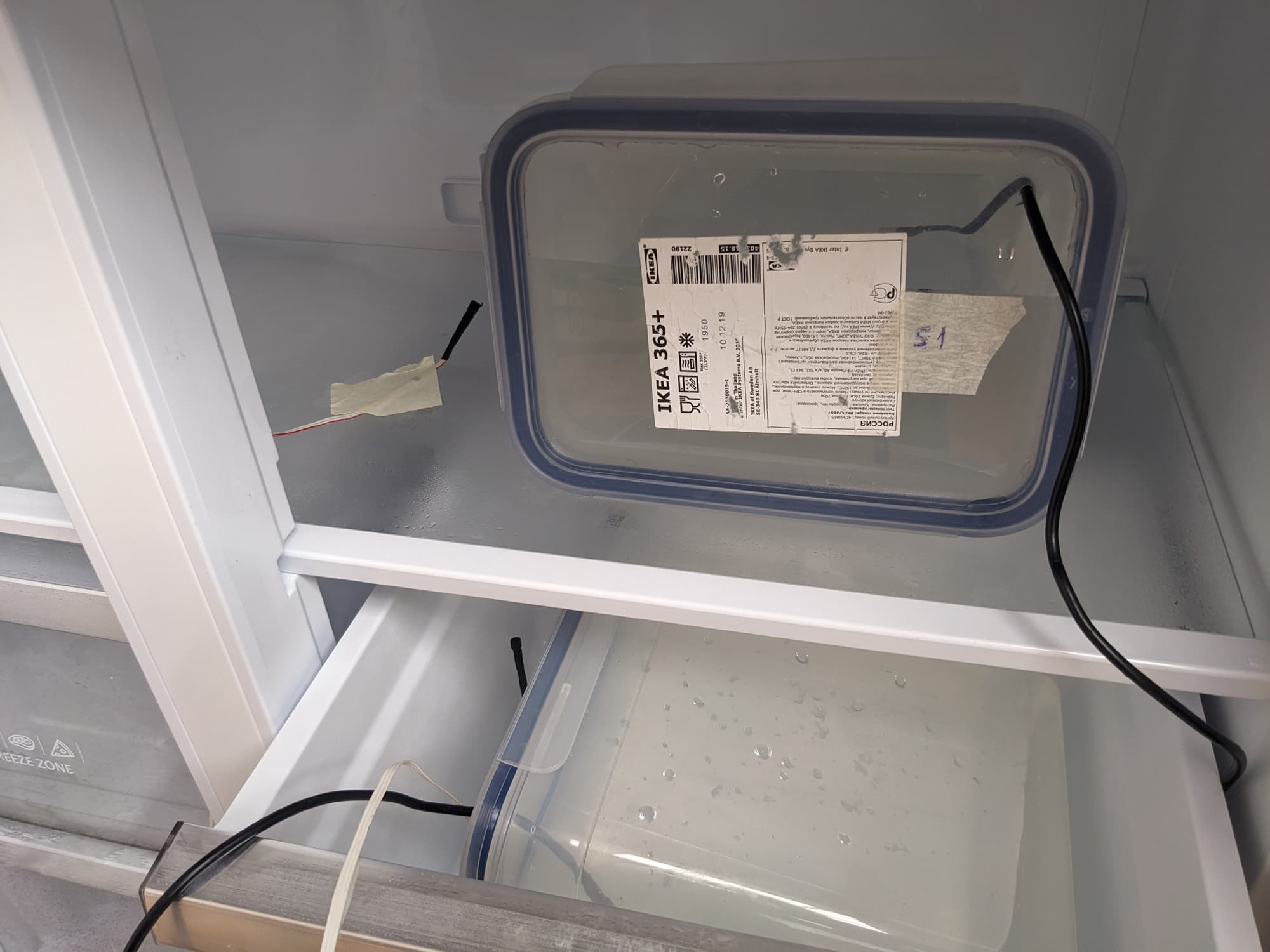 Помимо датчиков температуры воды использовались датчики температуры воздуха. Их мы поместили рядом с контейнерами в те же ящики — так, чтобы поверхность сенсоров не контактировала напрямую с элементами корпуса морозильной камеры.