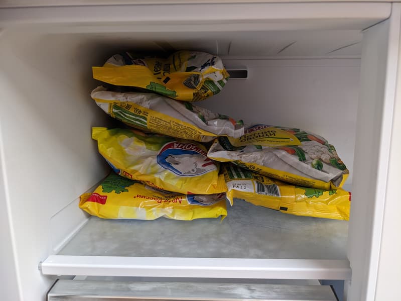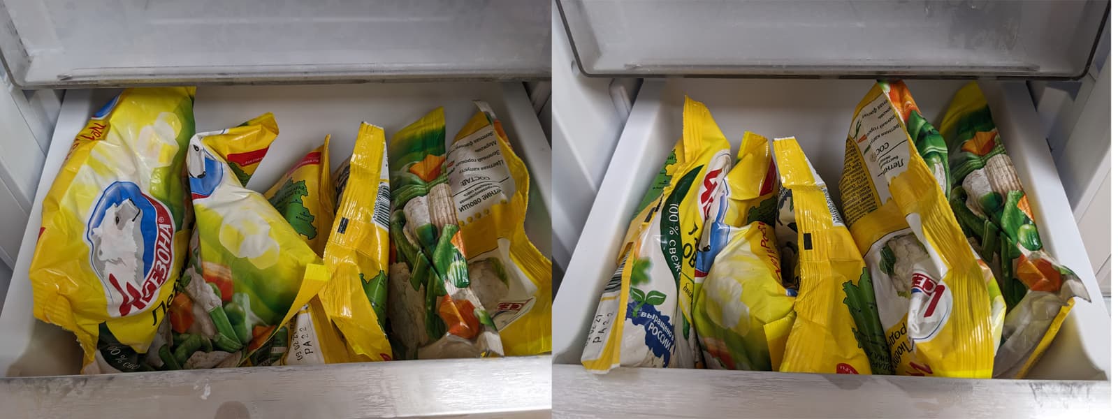 Для оценки емкости морозильной камеры мы по традиции используем 400-граммовые пакеты с замороженными овощами. Имеющегося под рукой количества упаковок, разумеется, не хватило для того, чтобы полностью забить широкую и объемную морозилку, но масштаб на фотографии передан наглядно.