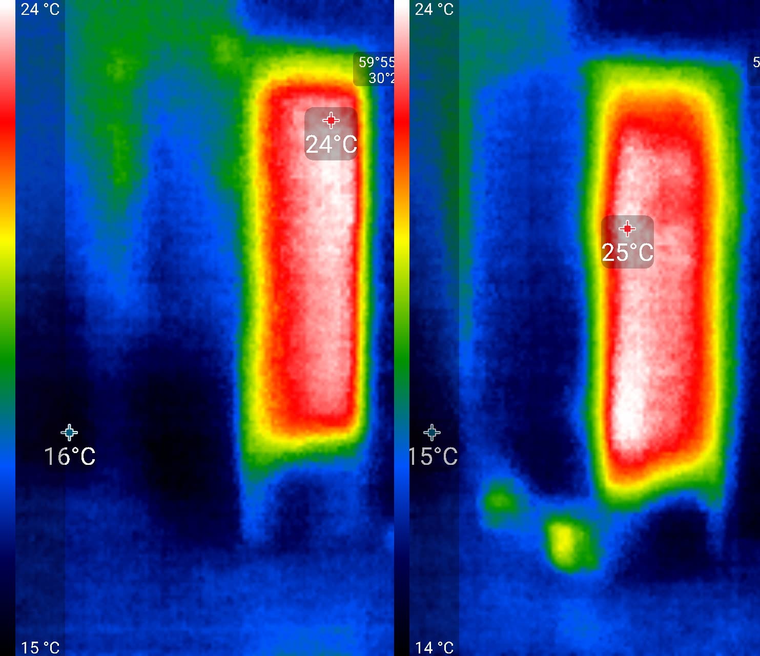 Боковые стенки, за которыми скрыты теплообменники, при работе нагреваются не слишком сильно. Как обычно, мы приводим фотографии включенного устройства в инфракрасном диапазоне.