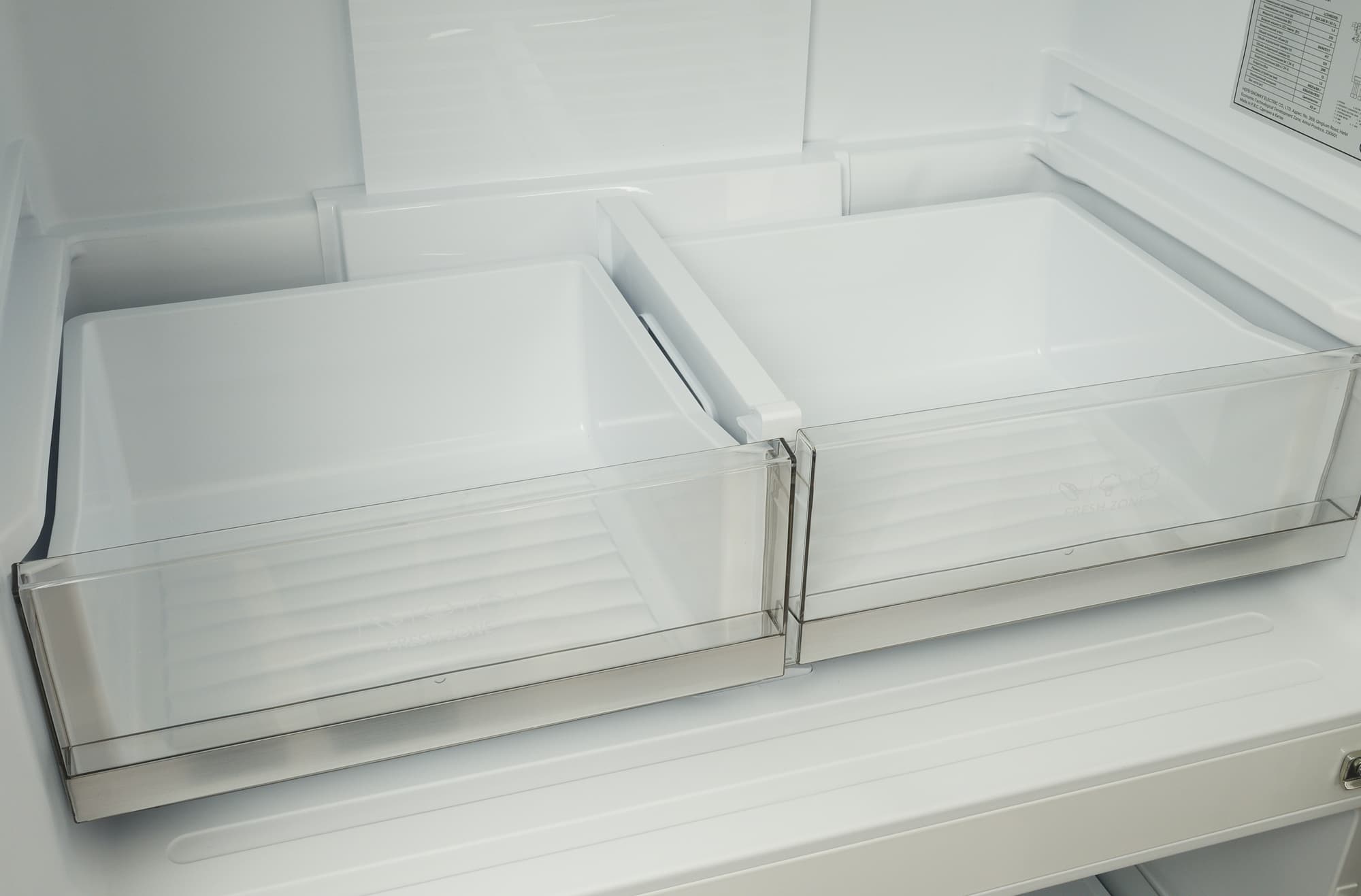 Шторок или других конструкций, позволяющих регулировать вентиляцию зоны свежести, у этой модели нет. У обоих пластиковых ящиков одинаковые конструкция и дизайн: стенки и дно белые, а передняя панель прозрачная. Однако их можно различить по размеру: левый чуть поуже, правый — пошире.
