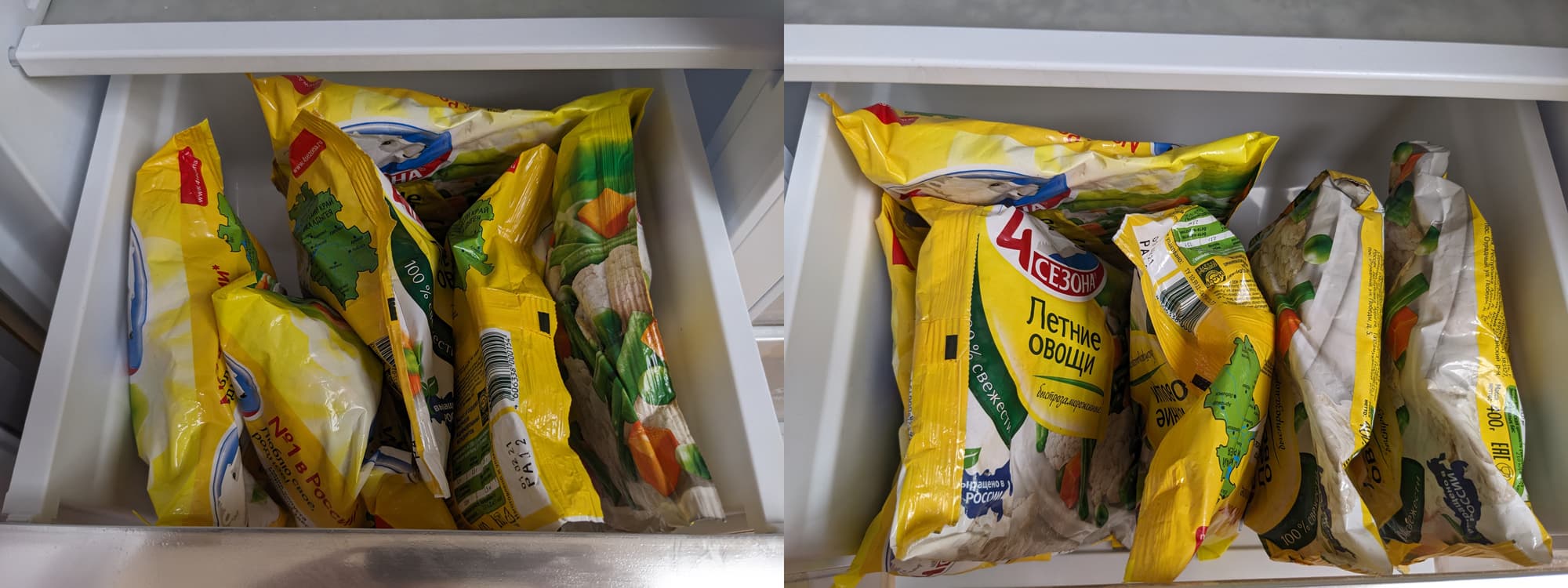Глубина нижних ящиков чуть меньше, чем у средних, так как за ними расположен отсек холодильного агрегата. Поэтому в каждом из них помещается только пять стандартных пакетов.