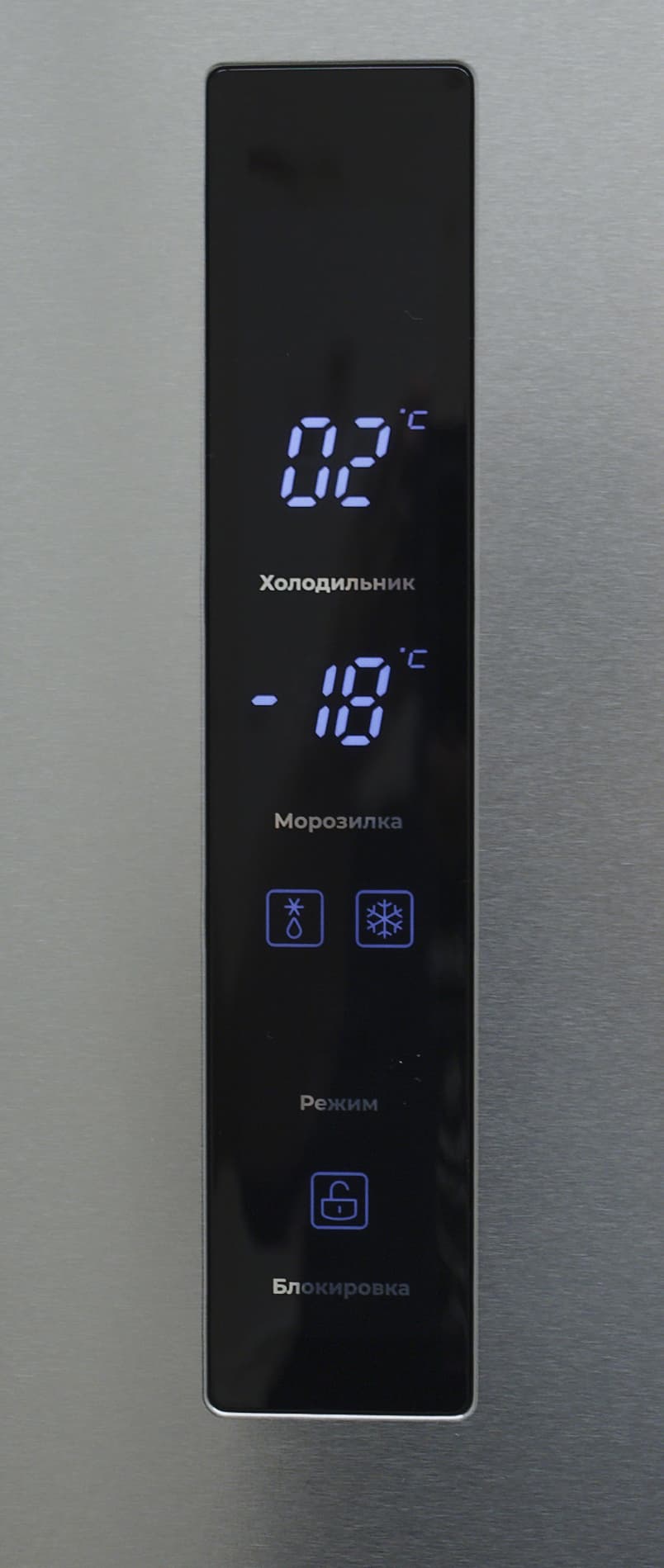 Надписи «холодильник» и «морозилка» обозначают скрытые сенсоры, которые позволяют установить температуру воздуха в отделениях. Последовательными нажатиями можно выбрать значения от +2 °C до +8 °C для верхней камеры и от −15 °C до −23 °C для нижней. Шаг выбора — 1 градус.