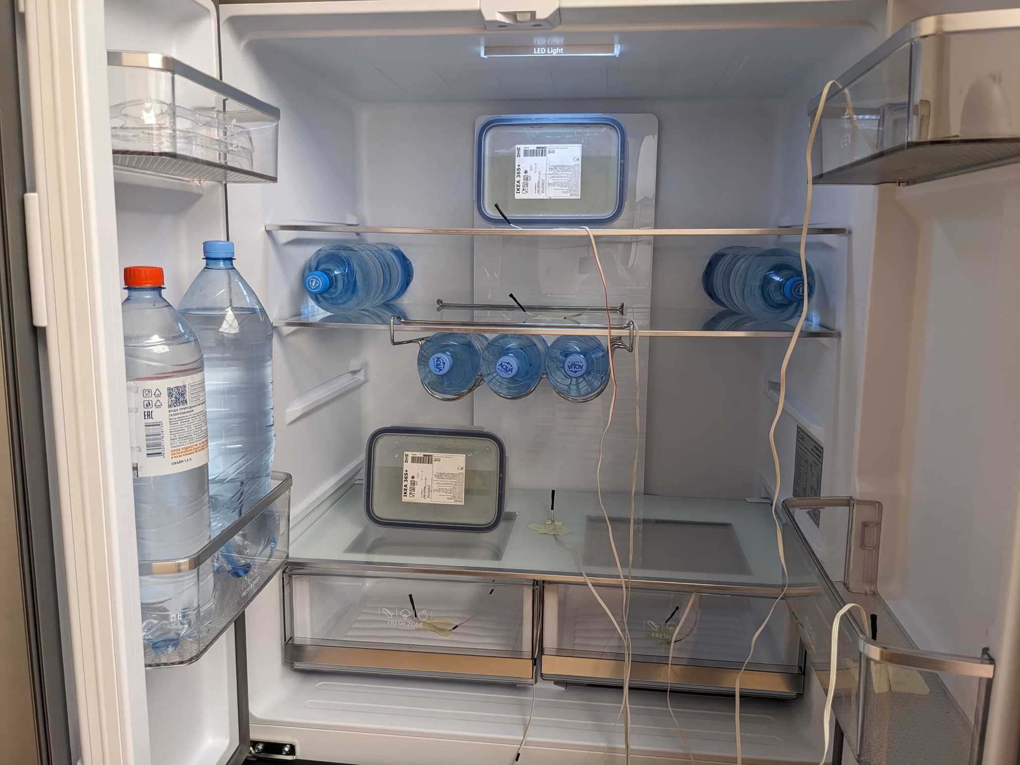 Измерения температуры воздуха внутри холодильной камеры проводились при помощи семи датчиков: три из них на полках, как можно ближе к их геометрическому центру, четвертый и пятый были опущены в ящики зоны свежести. Еще два мы закрепили на полках правой дверцы.