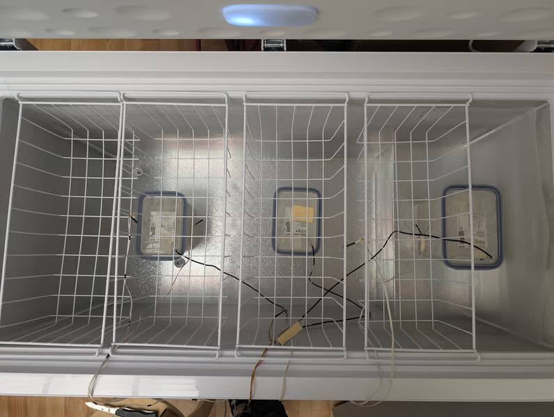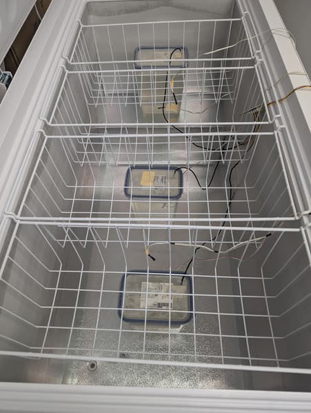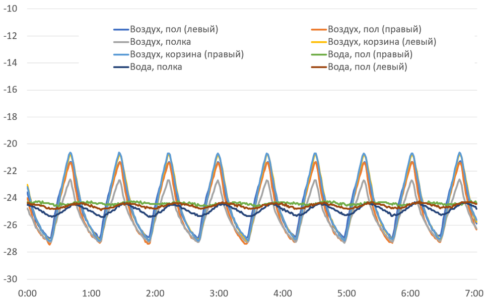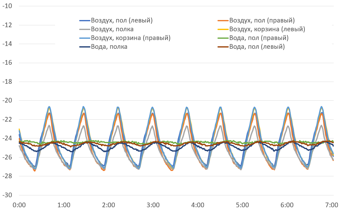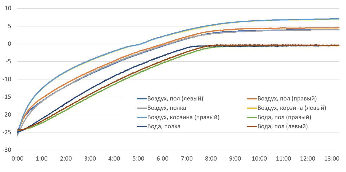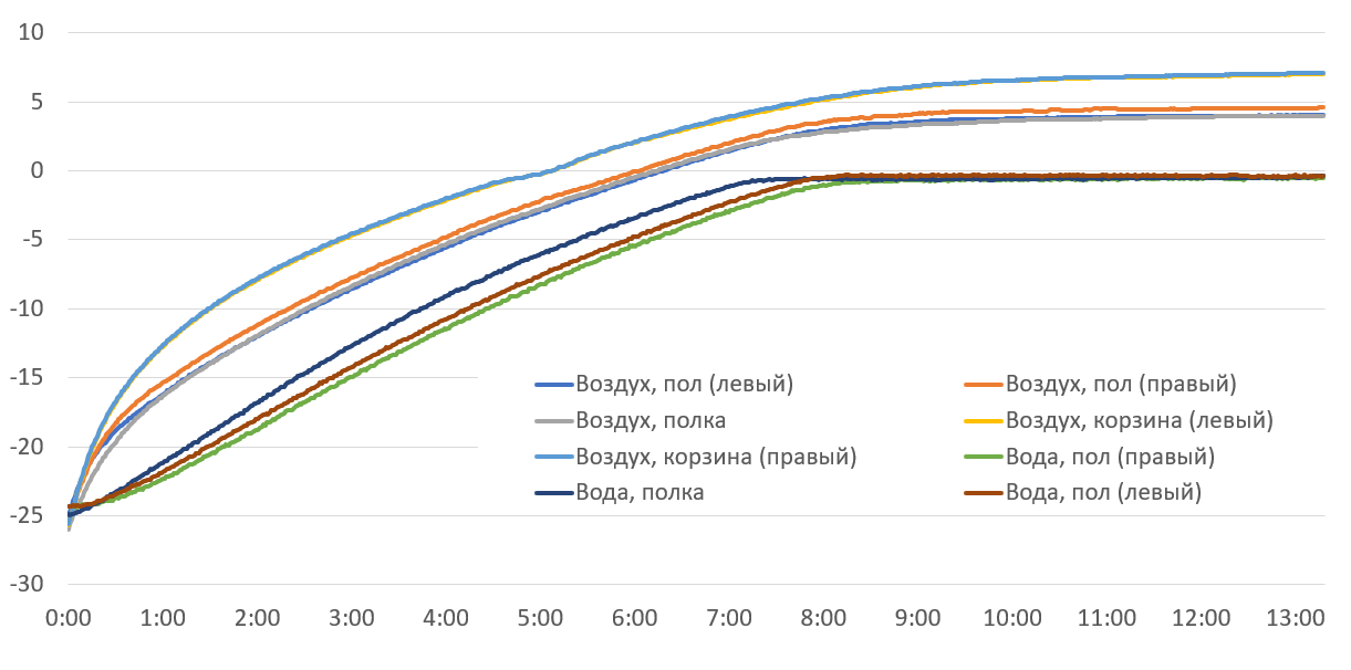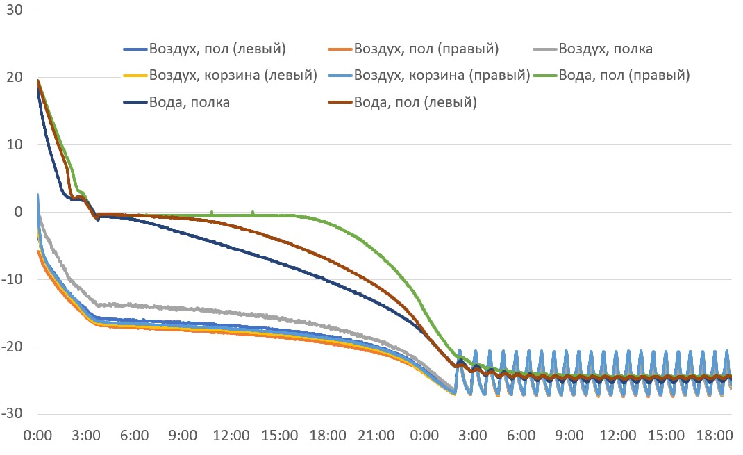 В контейнерах, стоящих на полу основного отделения, температура опустилась ниже нуля приблизительно через 6 часов со старта теста. Кристаллизация в контейнере, который стоял над холодильным агрегатом, началась несколько позже: минусовую отметку температура содержимого в нем пересекла через 16 часов с начала эксперимента. Примерно через 30 часов температура воздуха и льда стабилизировалась на значениях 22-28 градусов ниже нуля.
