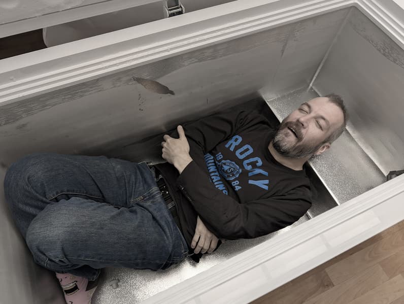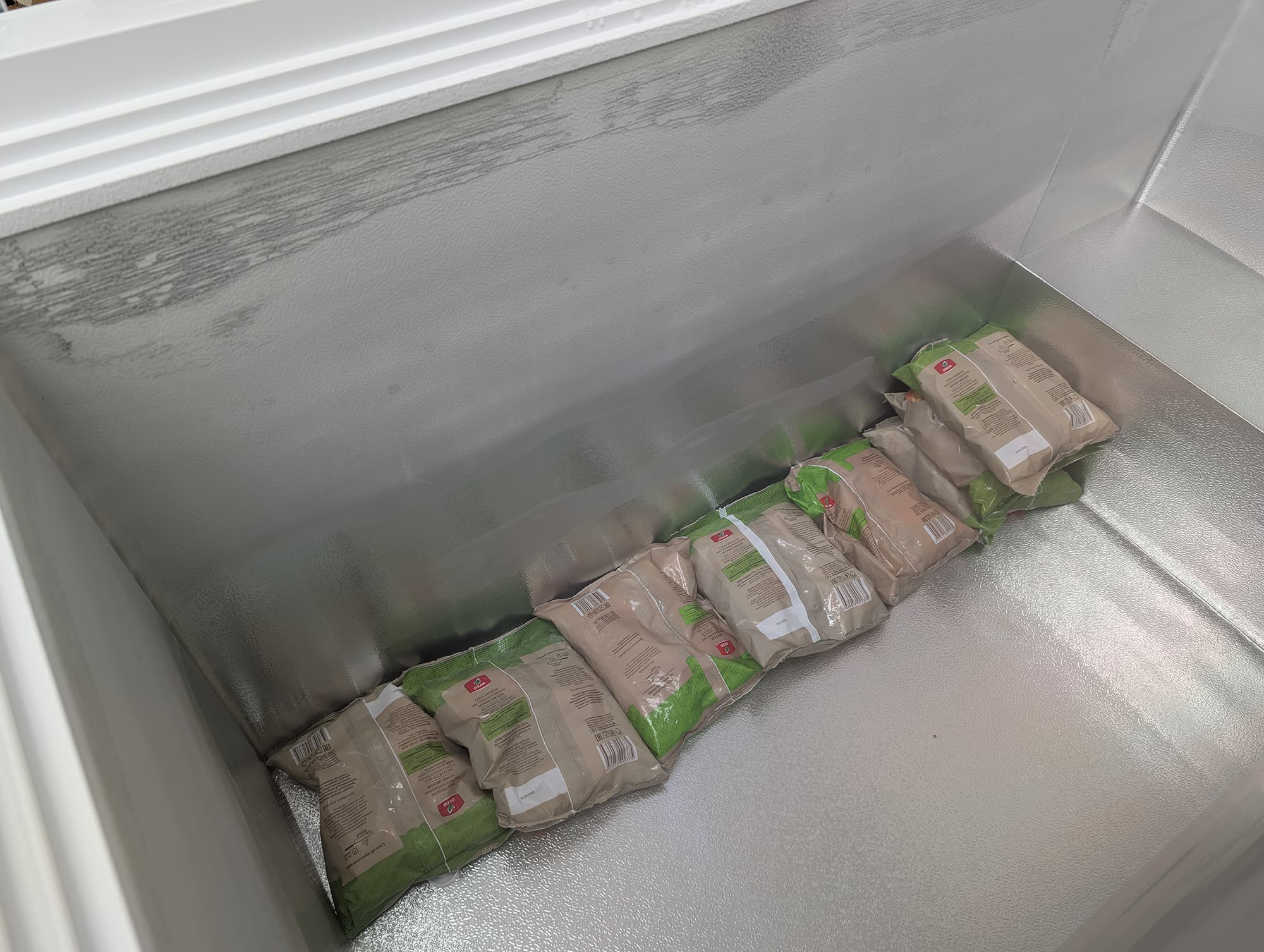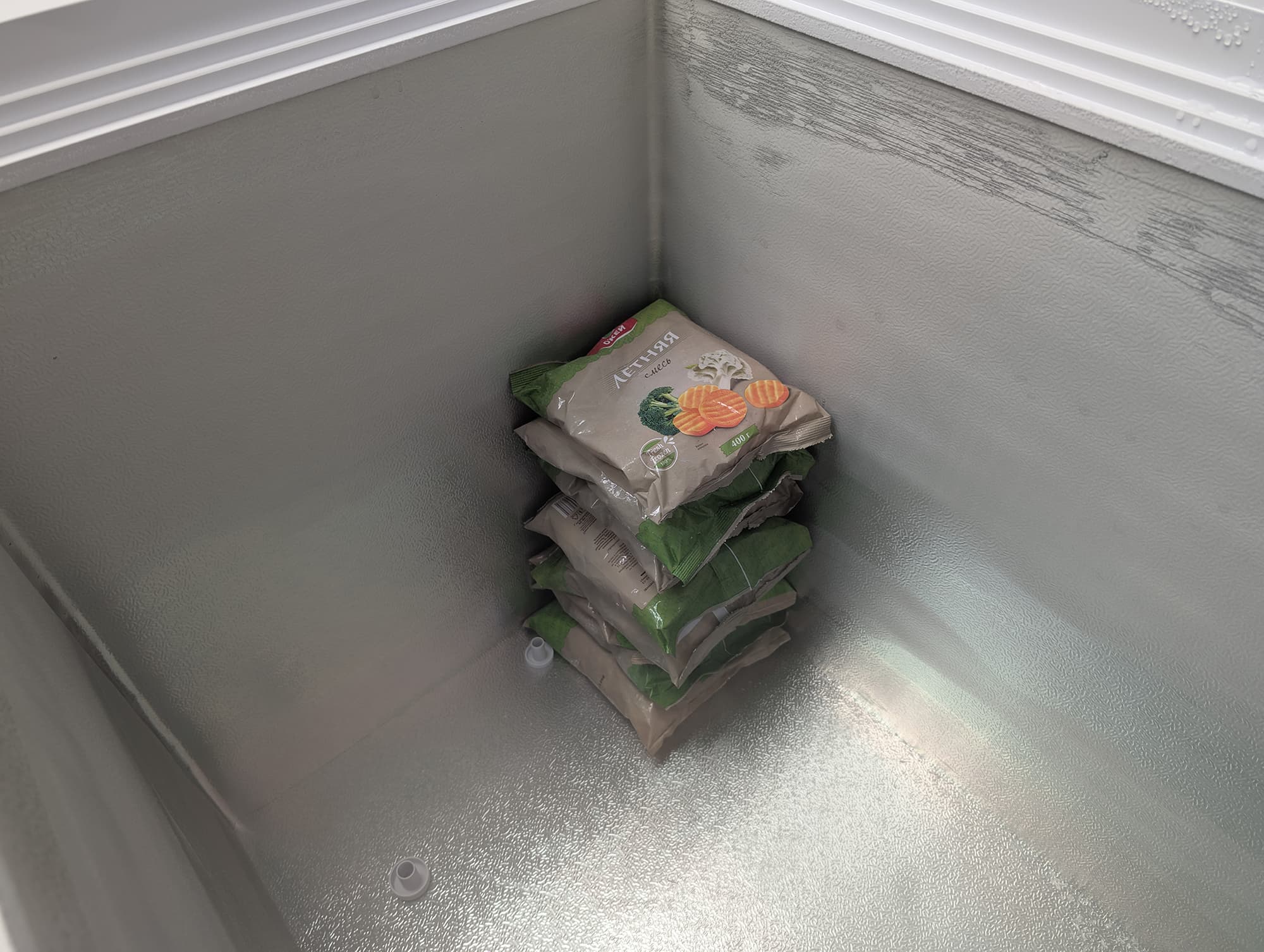 С помощью стандартных пакетов с замороженными овощами сложно оценить реальную вместимость большого морозильного ларя, и наш коллега из питерской лаборатории любезно согласился помочь проиллюстрировать объем агрегата на живом примере.