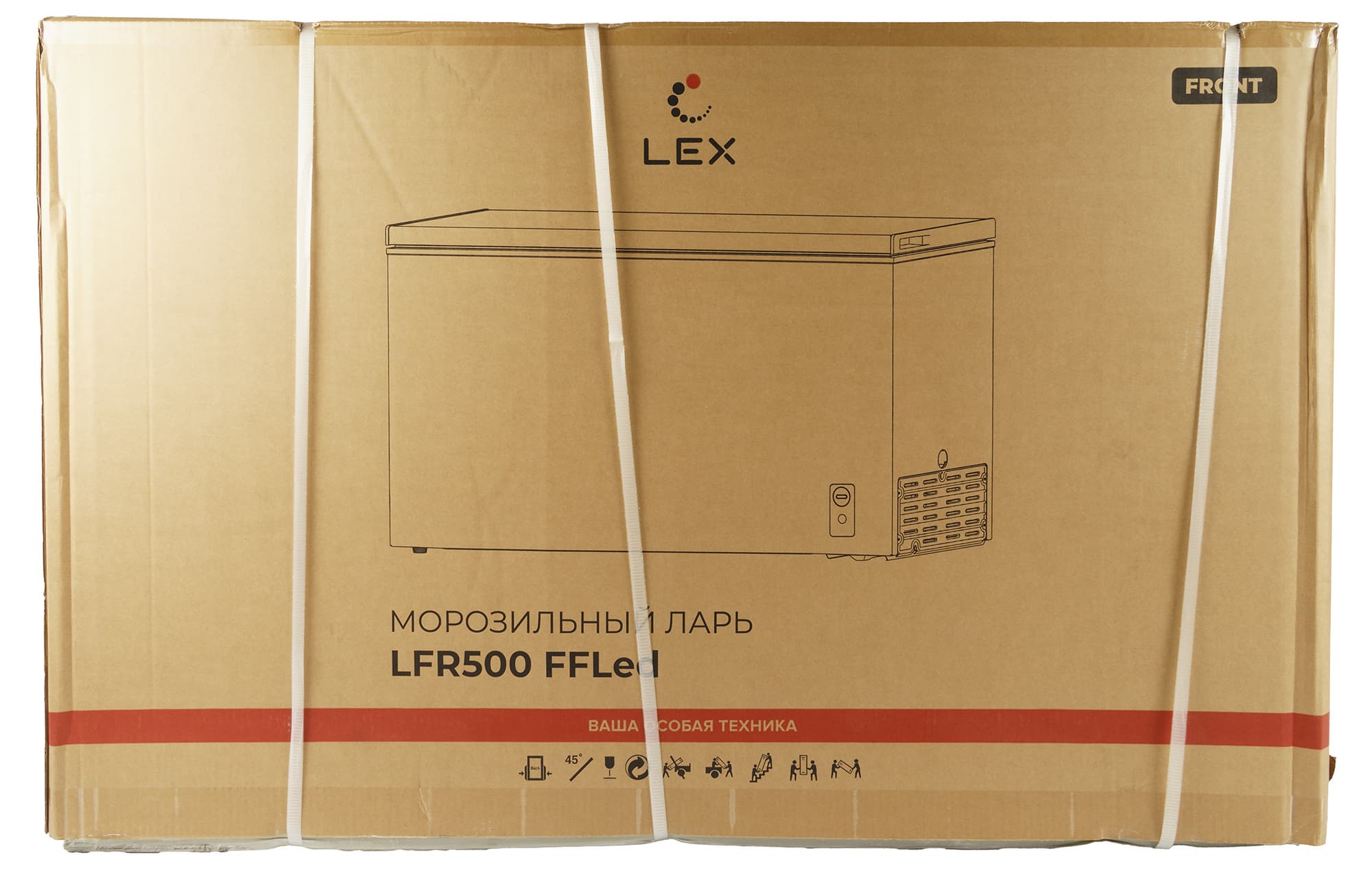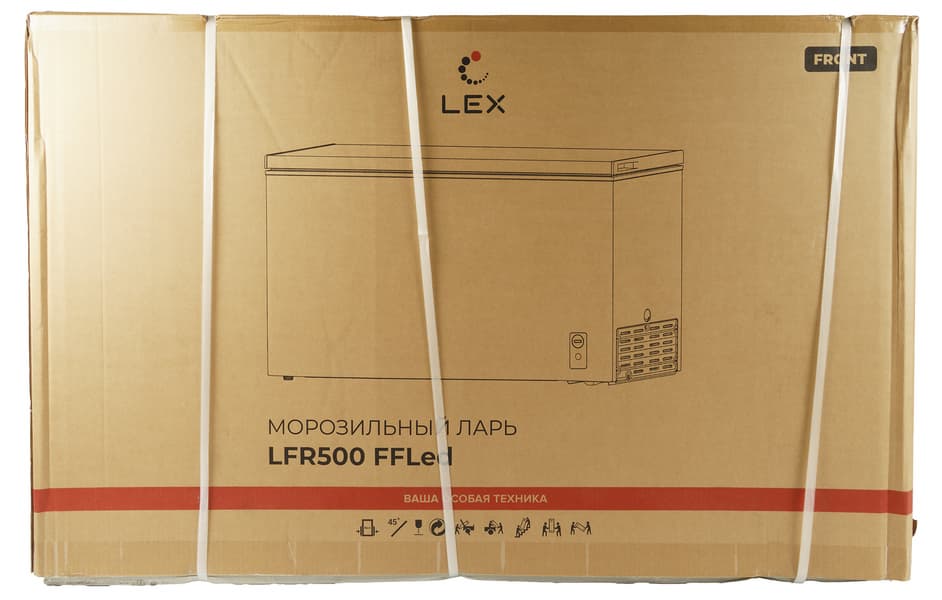 Морозильный ларь Lex LFR500 FFLed поставляется в картонном коробе, который установлен на пенопластовое основание и притянут к нему капроновыми стропами.