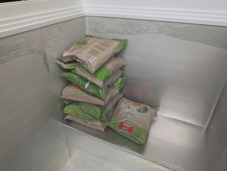 Помимо традиционных, с помощью рулетки, измерений внутреннего объема морозильной камеры мы также демонстрируем ее вместимость на наглядных примерах, используя стандартные (400 г) пакеты с замороженными овощами.