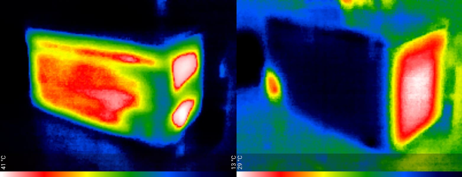 Решетки теплообменников у этой модели скрыты за передней и боковыми стенками, которые довольно заметно (до 37-41 °C) нагреваются при работе. Задняя стенка остается относительно холодной: устройство вполне можно ставить вплотную к стене или мебели.