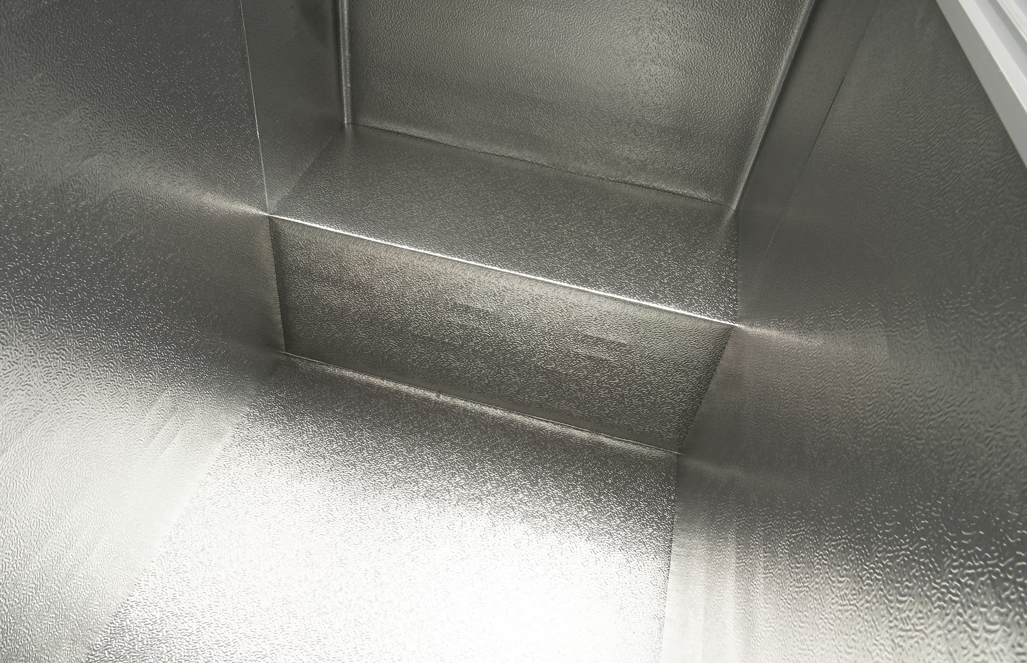 Внутреннее пространство отделано текстурированным алюминием. Ниша холодильного агрегата образует небольшую ступеньку: это традиционная особенность этого класса устройств.