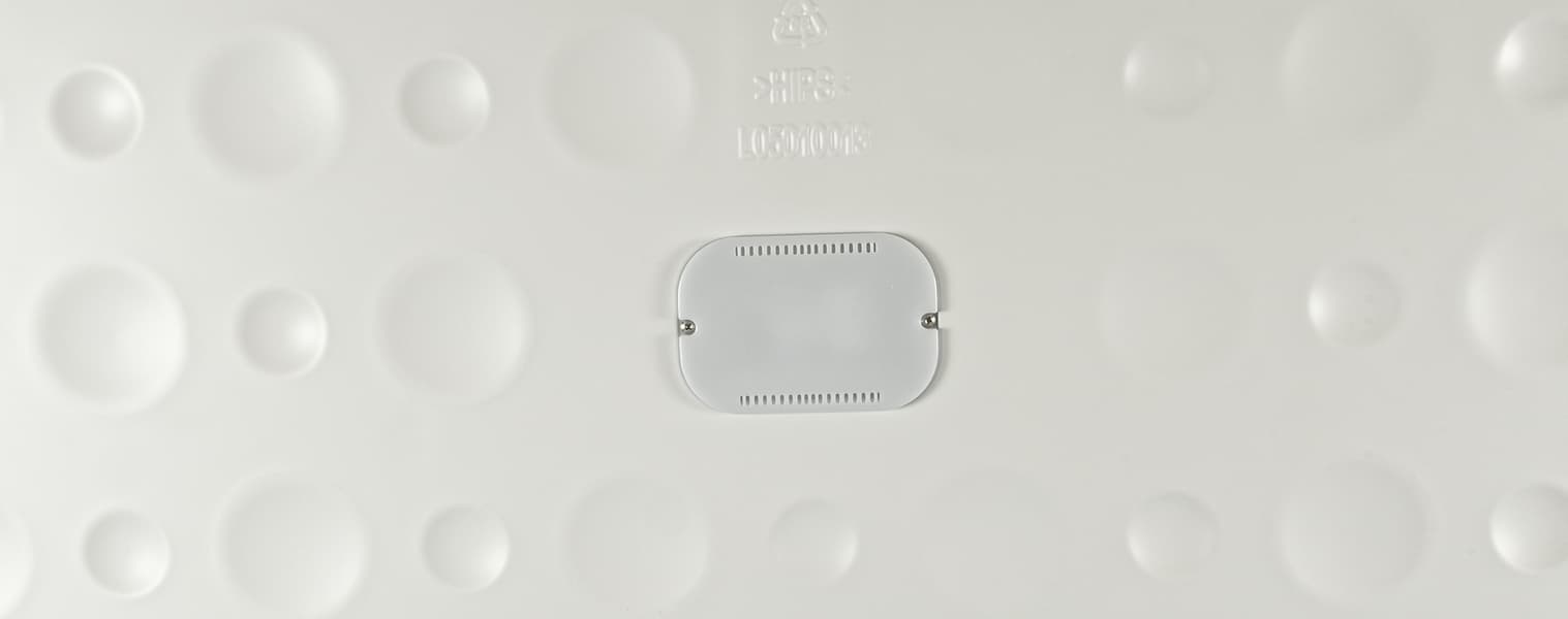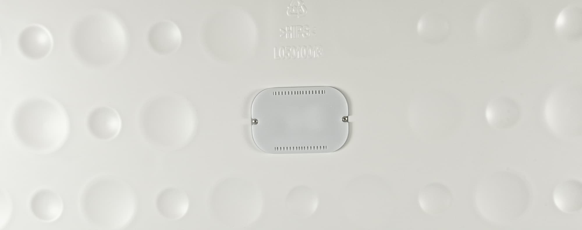 На задней стенке расположена ниша для вилки электропровода при хранении и транспортировке устройства. В правом нижнем углу задней стенки мы видим отверстие для слива конденсата, закрытое пластиковой пробкой. Это совершенно необходимый элемент для холодильного устройства, размораживаемого вручную: системой NoFrost наш ларь, как и подавляющее большинство всех морозильных ларей, не оборудован.