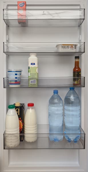 На нижней полке дверцы можно без труда разместить внушительное количество емкостей с напитками: сюда помещаются бутылки объемом до двух литров.
