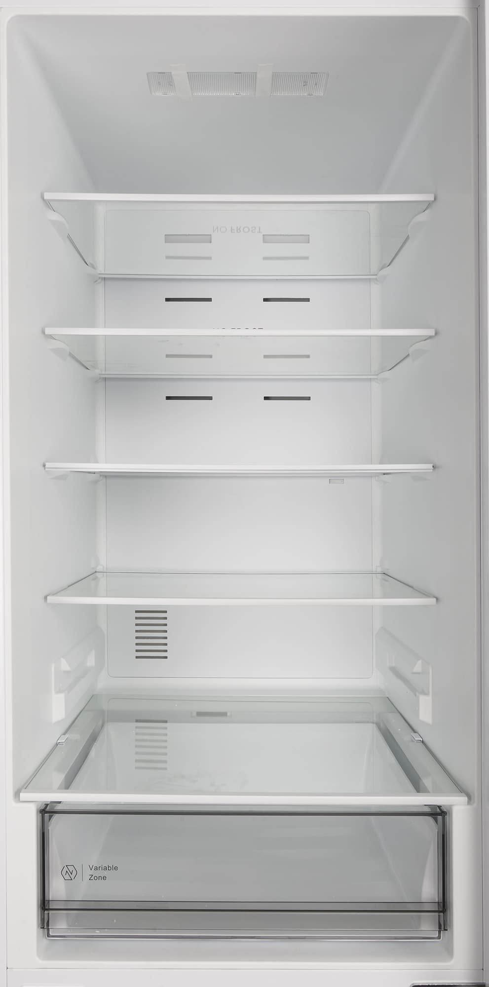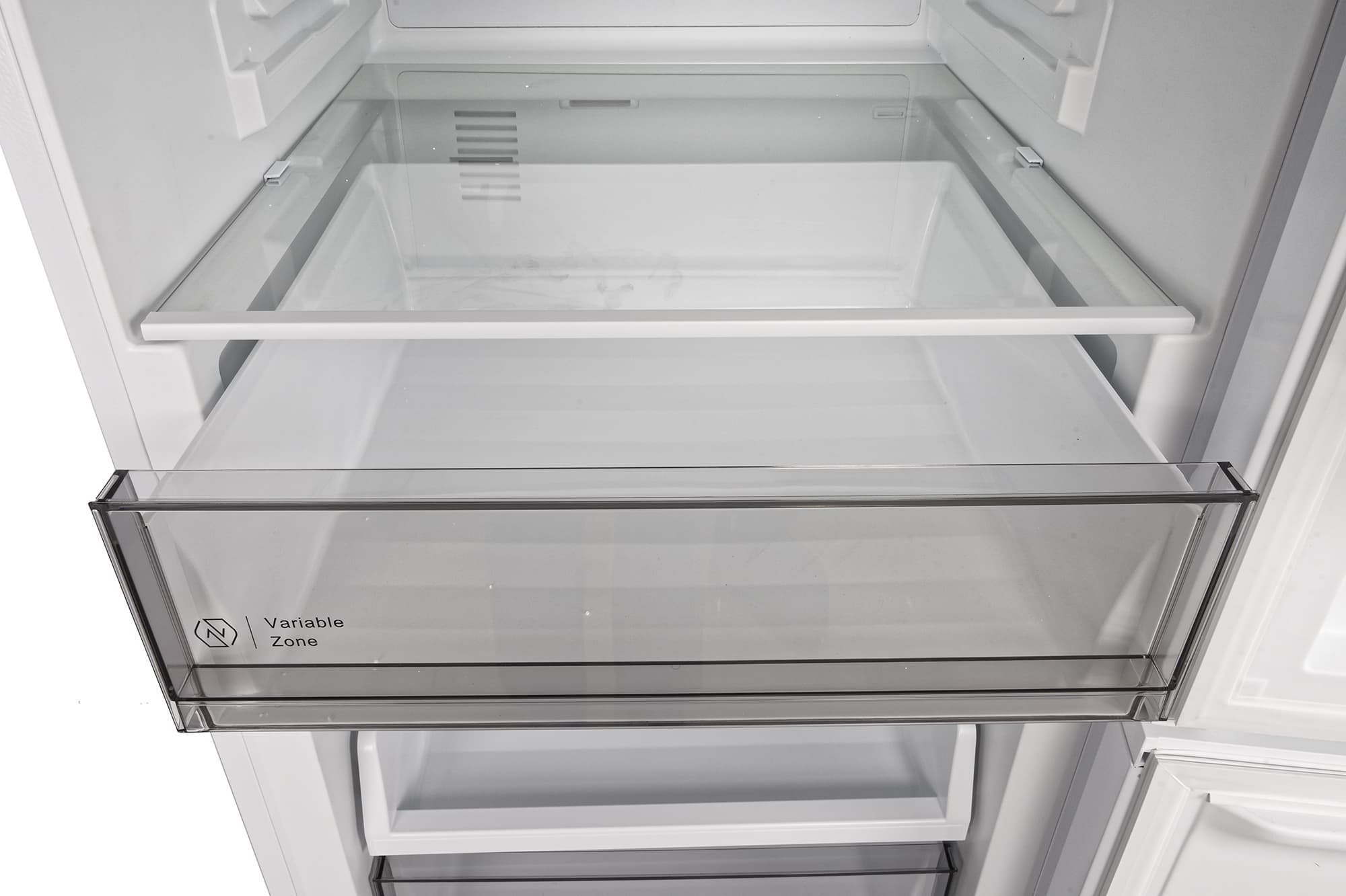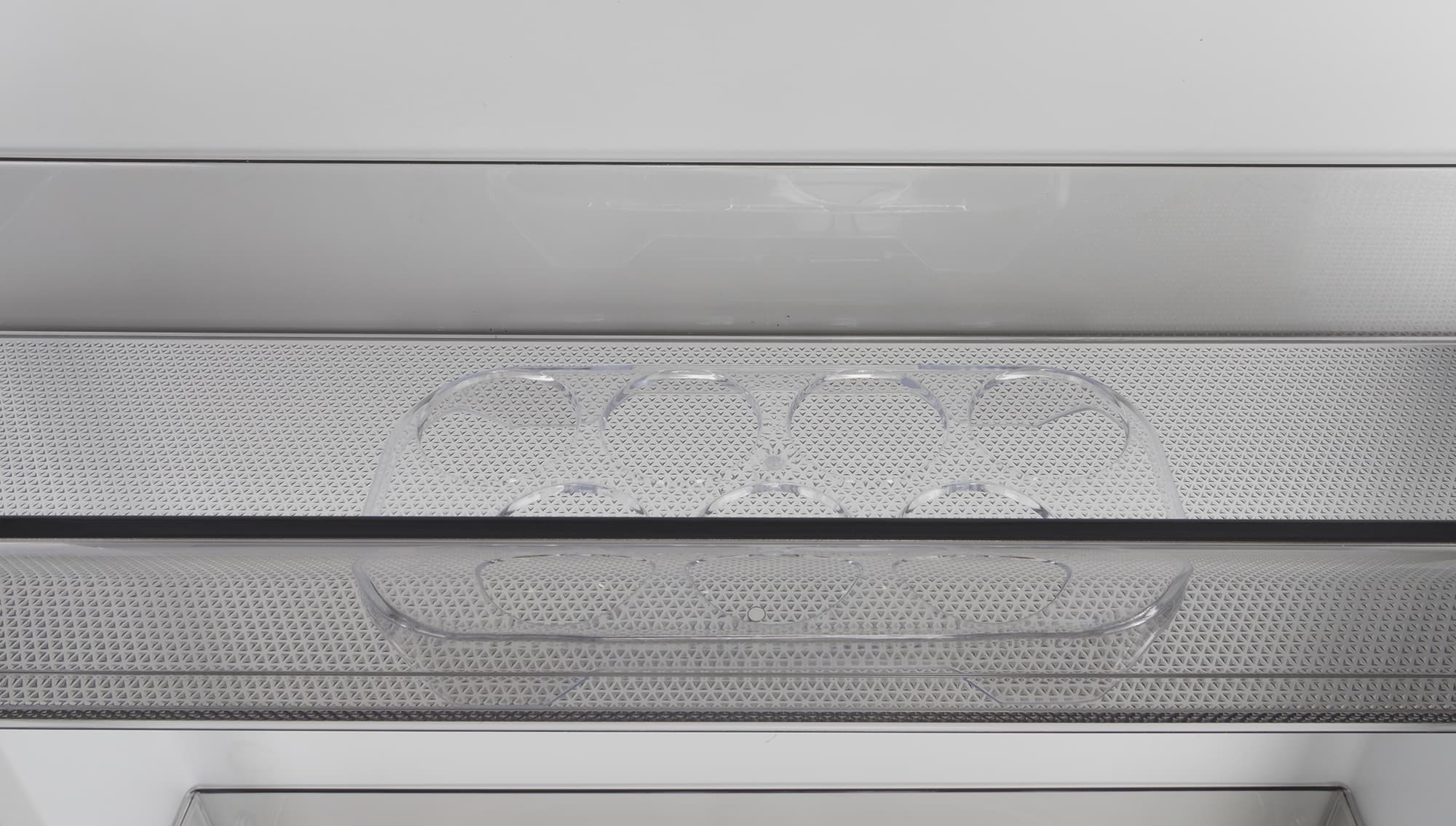 Две трети задней стенки морозилки занимает пластиковая фальшпанель, распределяющая поток холода. И холодильное, и морозильное отделения оборудованы системой NoFrost.