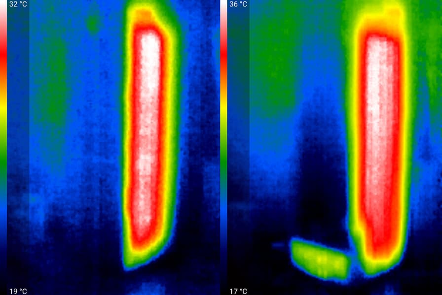 Трубки теплообменника у Lex LKB201WIDMax скрыты за боковыми стенками. Они заметно нагреваются при работе — это особенно хорошо видно на фотографиях, сделанных с помощью тепловизора.
