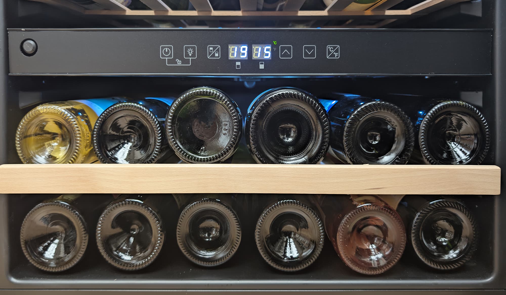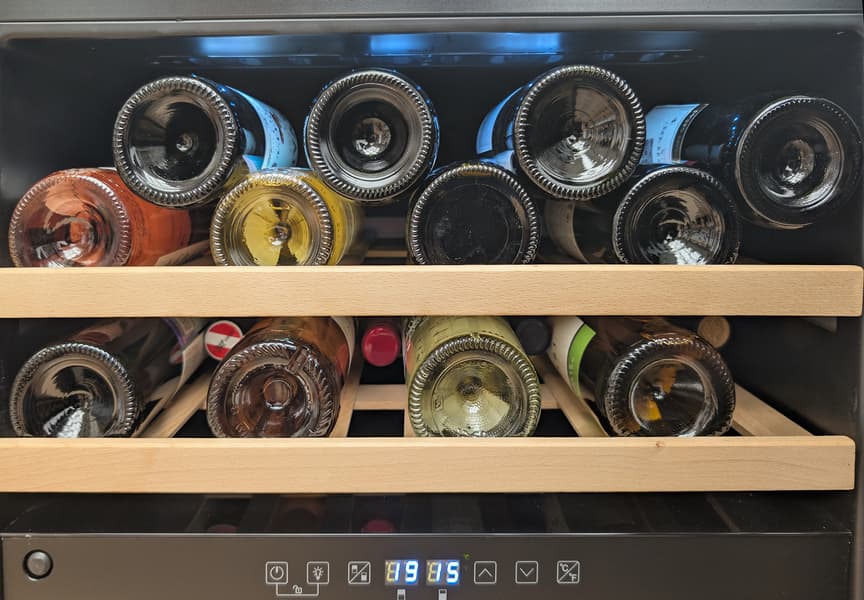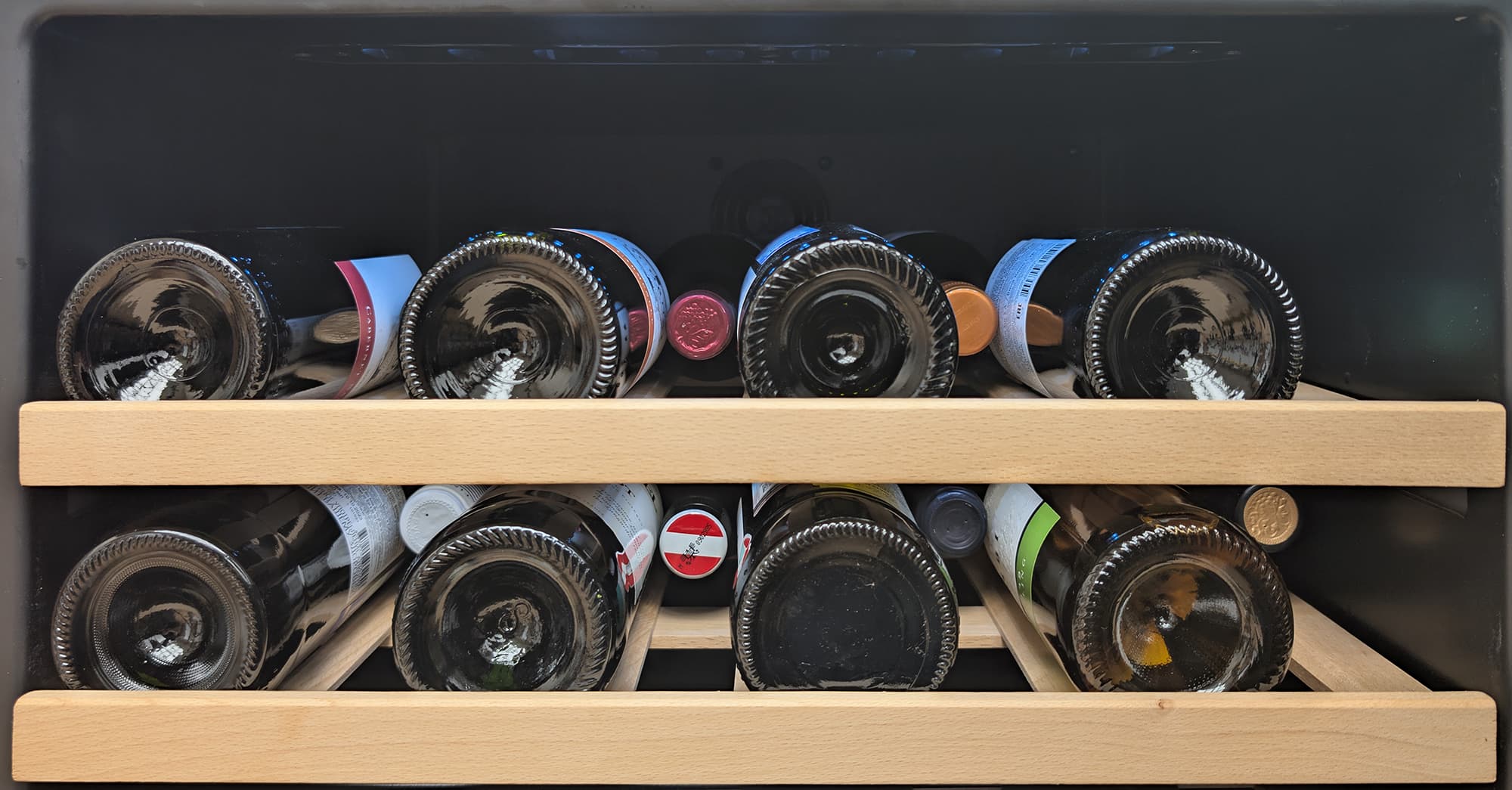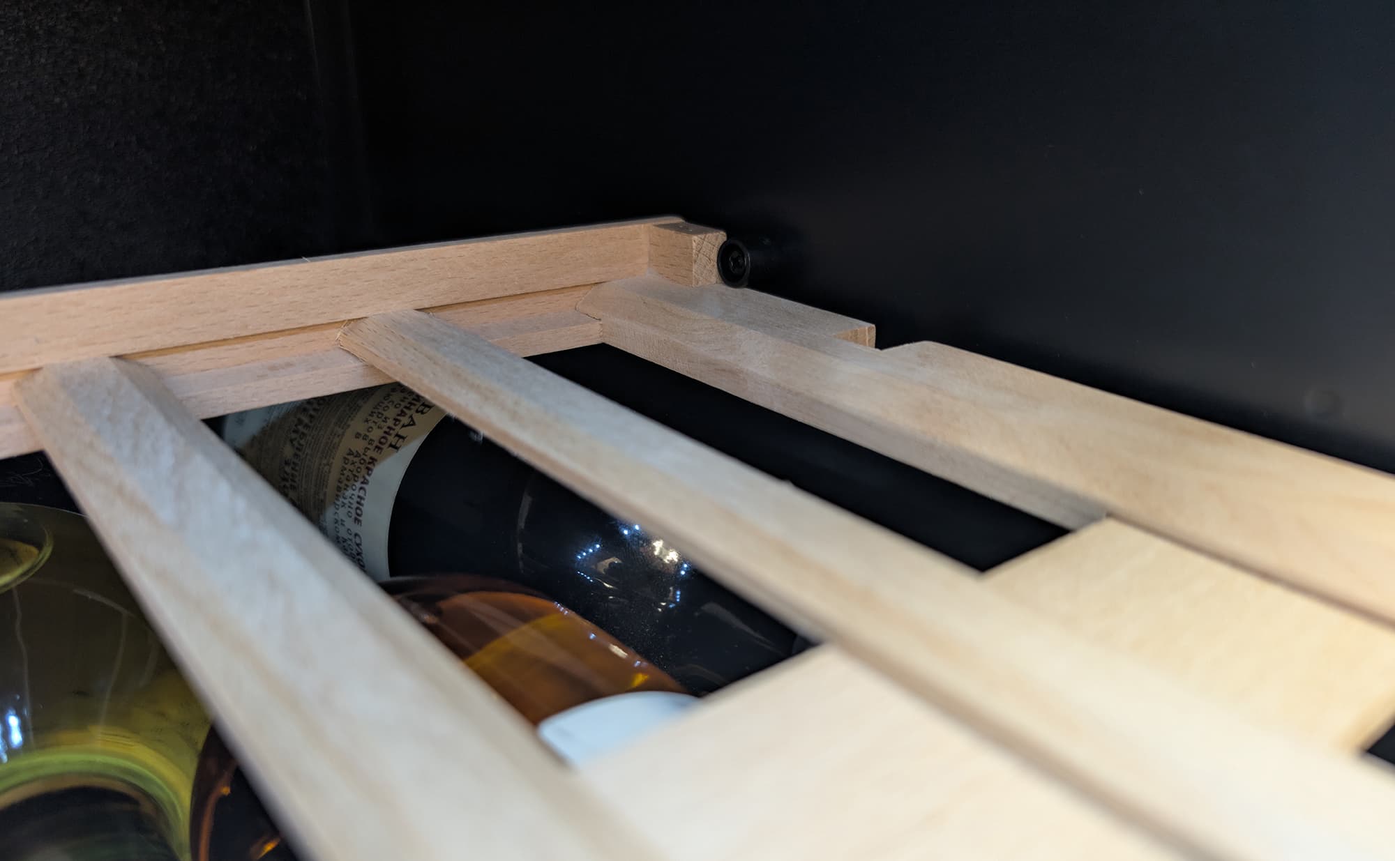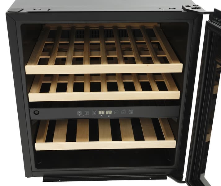 Шкаф рассчитан, разумеется, на горизонтальное хранение бутылок. Они размещаются на трех полках из некрашеного букового дерева: на древесине не скапливается конденсат, который может повредить этикетки и испортить пробки.