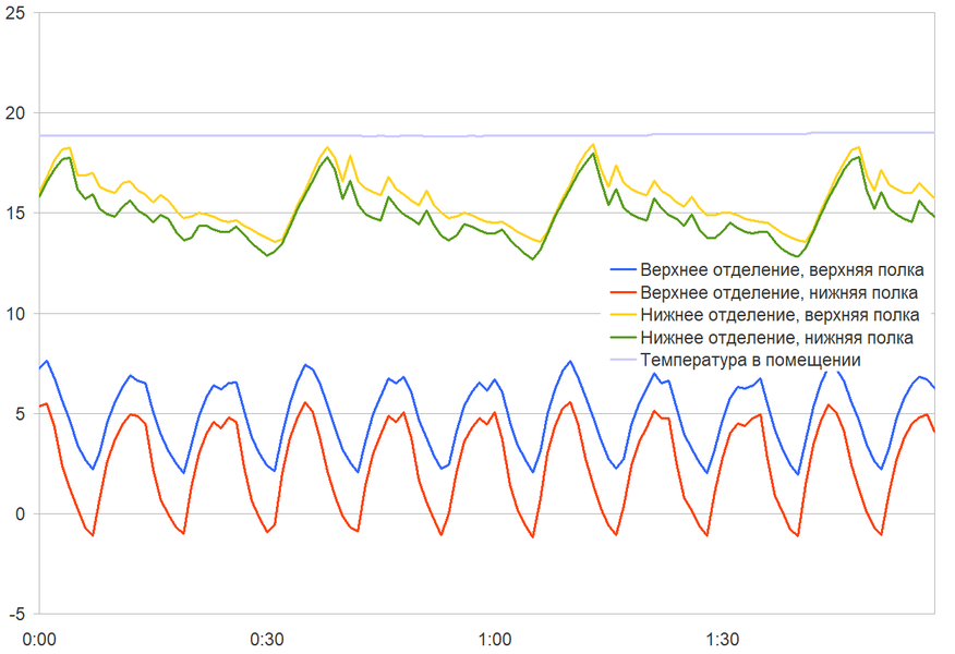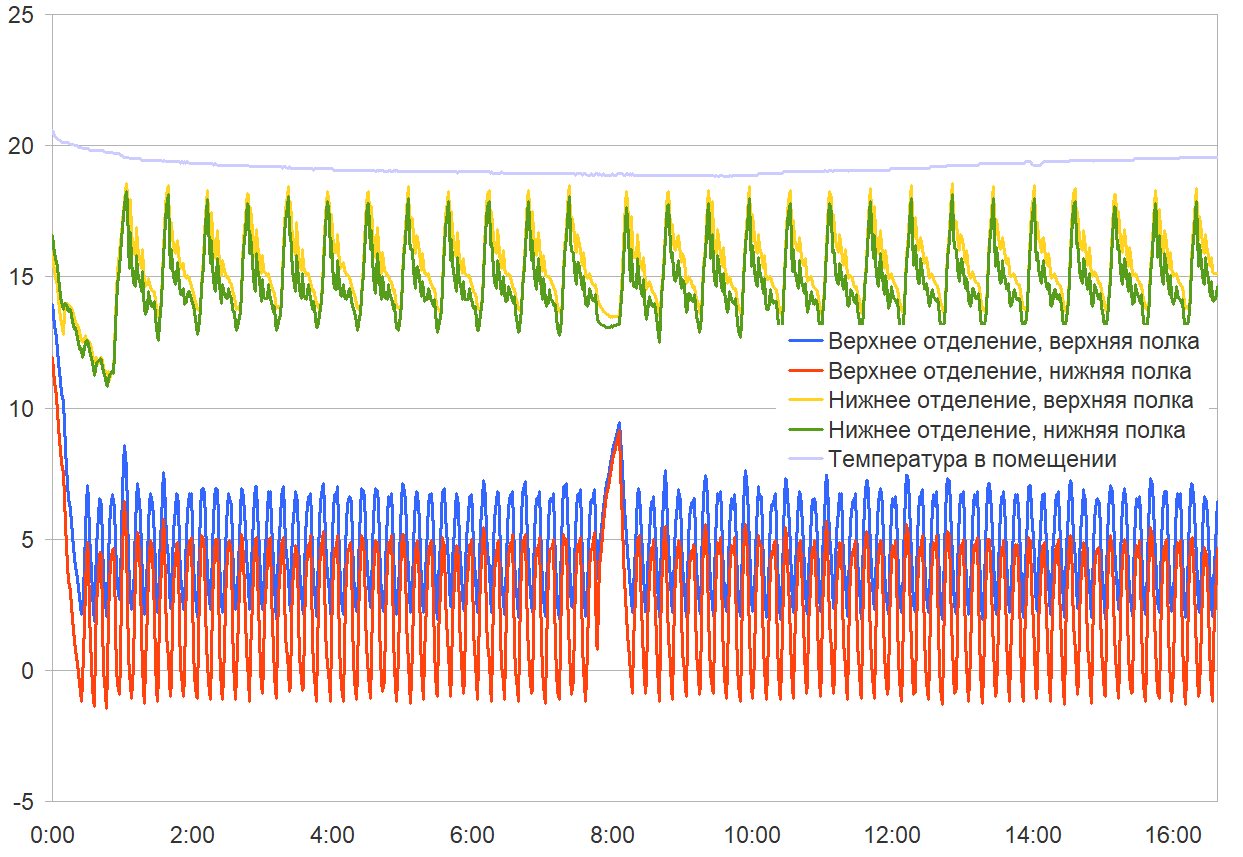 Считаем необходимым еще раз подчеркнуть, что приведенные графики иллюстрируют не потребительские качества, а особенности логики работы холодильного агрегата и циркуляции холодного воздуха между зонами. Не следует удивляться таким, на первый взгляд, существенным колебаниям: охлажденные бутылки обладают значительно большей тепловой инерцией, нежели воздух в камере, и переносят циклические изменения температуры нормально.