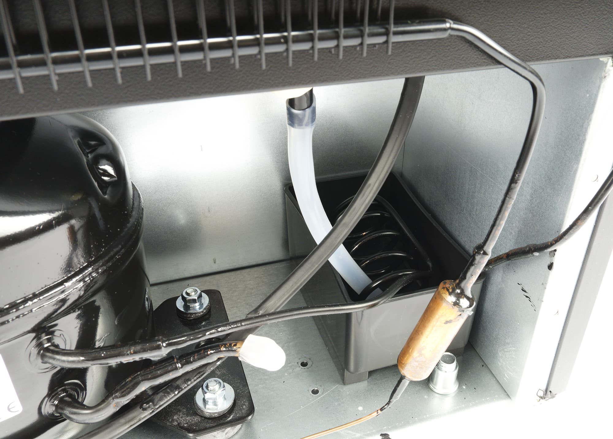 Большую часть нижней стенки занимает змеевик конденсатора. У этой модели он открытого типа.