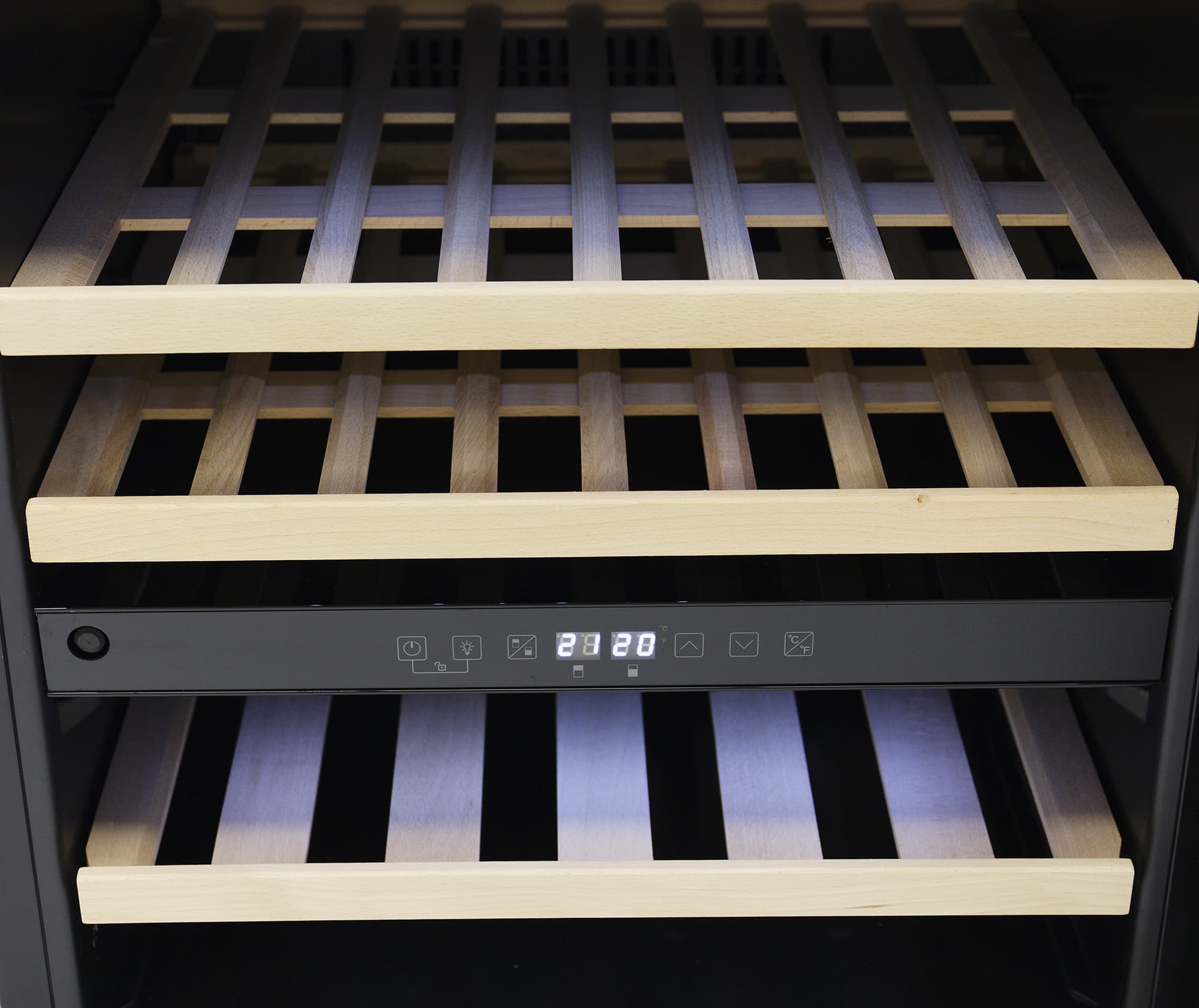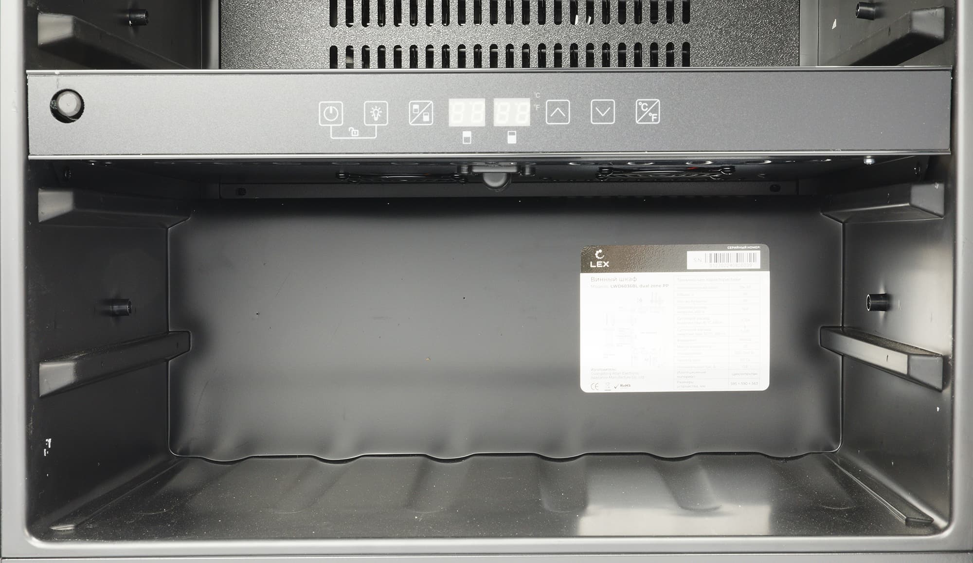 Как можно догадаться по индексу модели, Lex LWD6036BL dual zone PP — двухзонный шкаф. Его объем поделен на две камеры с раздельной установкой температурного режима. Верхняя камера — побольше, нижняя — чуть поменьше.