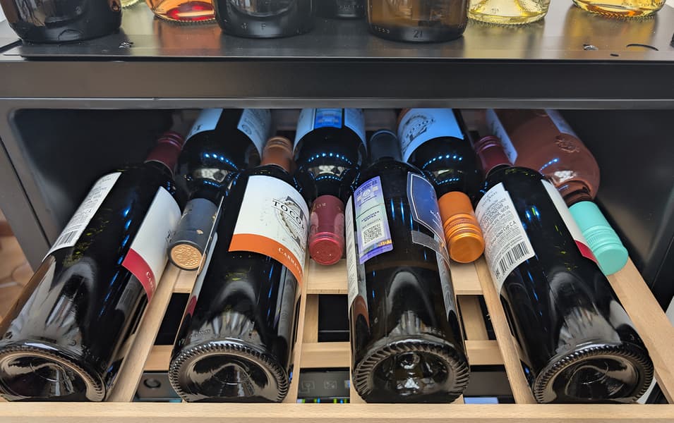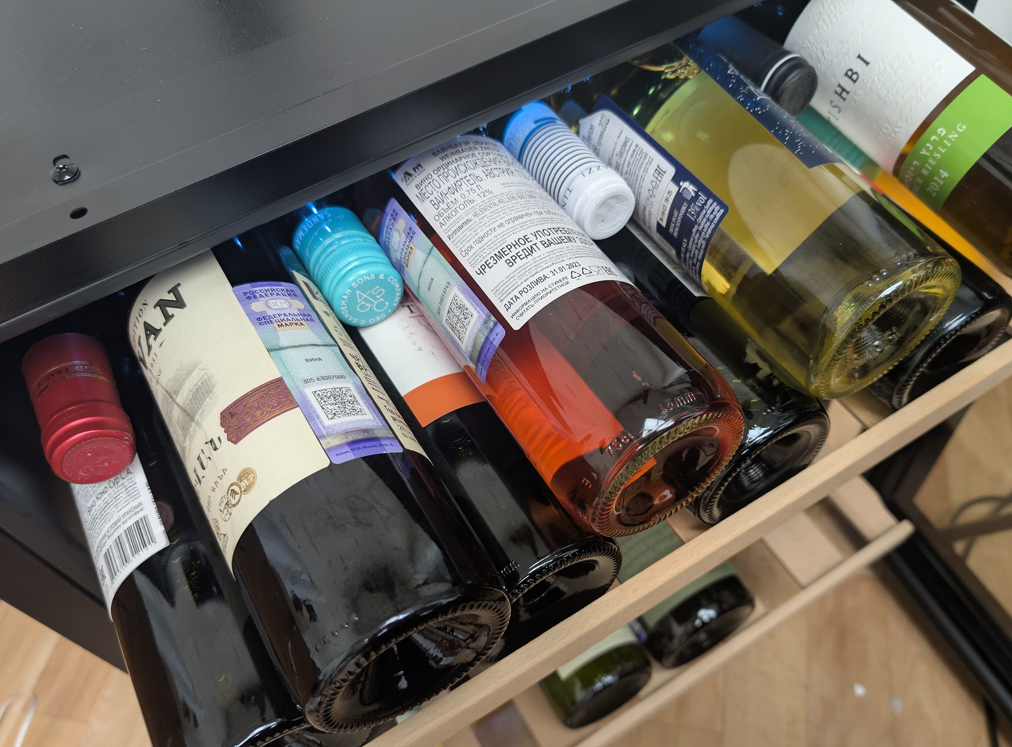 Как уже отмечалось, при хранении нестандартных сосудов, отличающихся по размеру от бутылки бордо, укладка может быть неравномерной: на фото выше видно, как из-за увеличенной бутылки во втором ряду верхней полки соседняя лежит неровно и опирается на стенку камеры.
