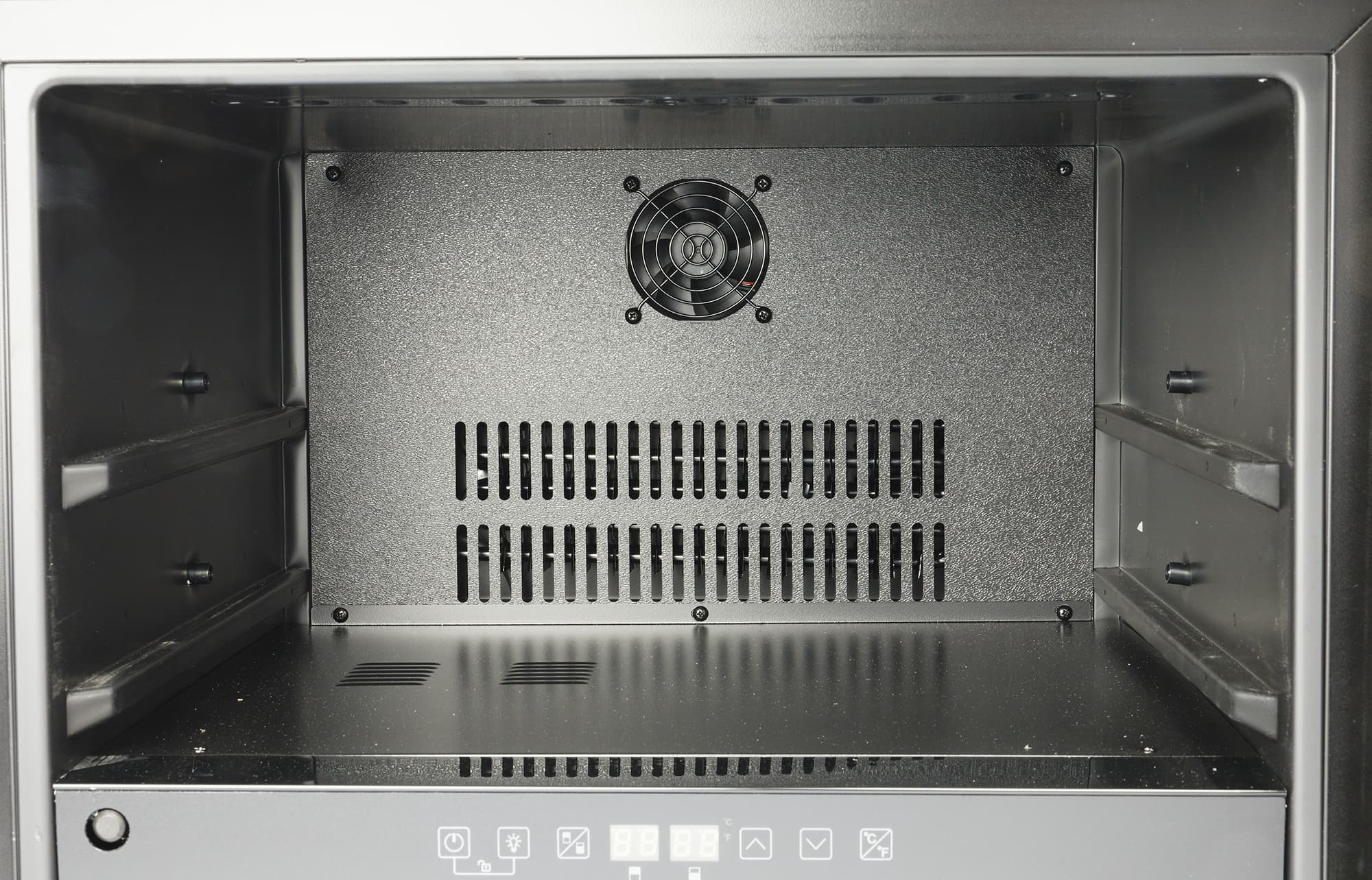 Между камерами расположен электронный блок с панелью управления, толкателем системы автоматического открывания и системой вентиляции. Оба объема оборудованы светодиодными светильниками, дающими неяркий холодный свет.