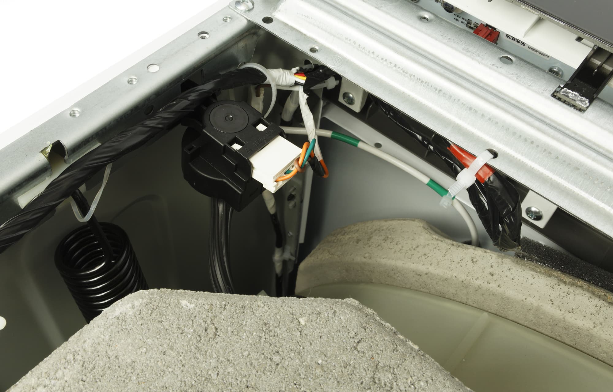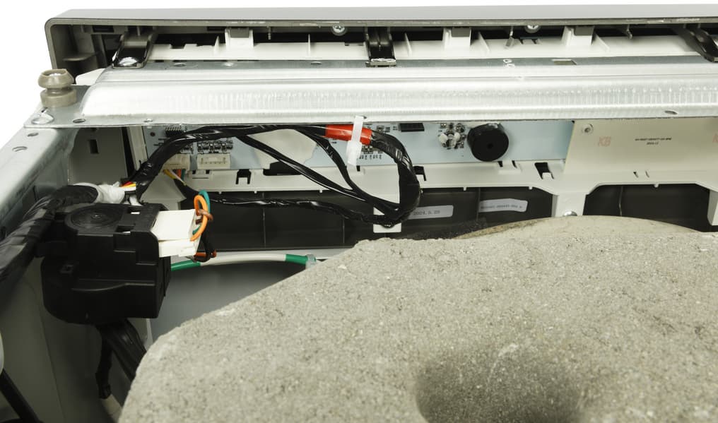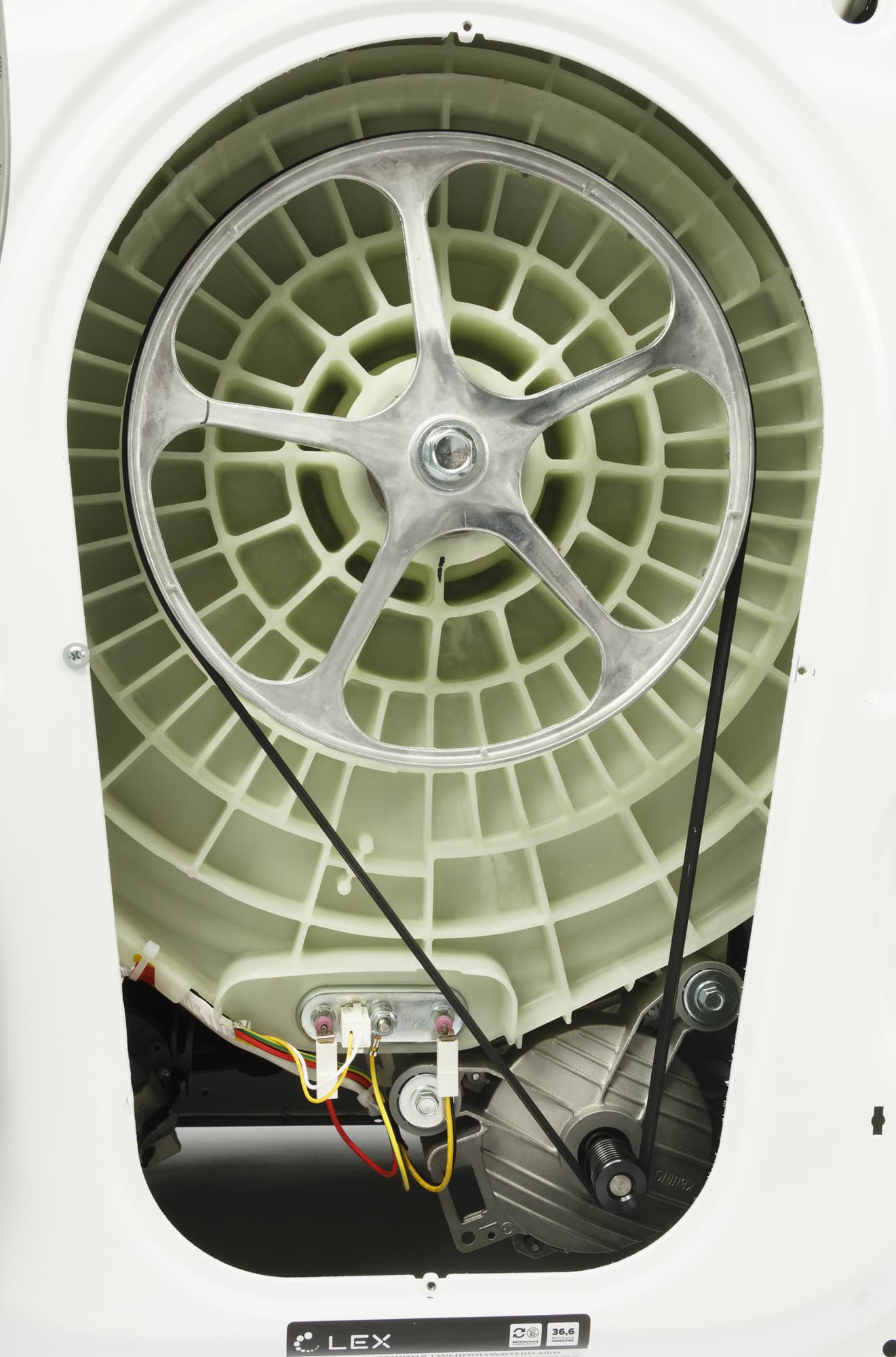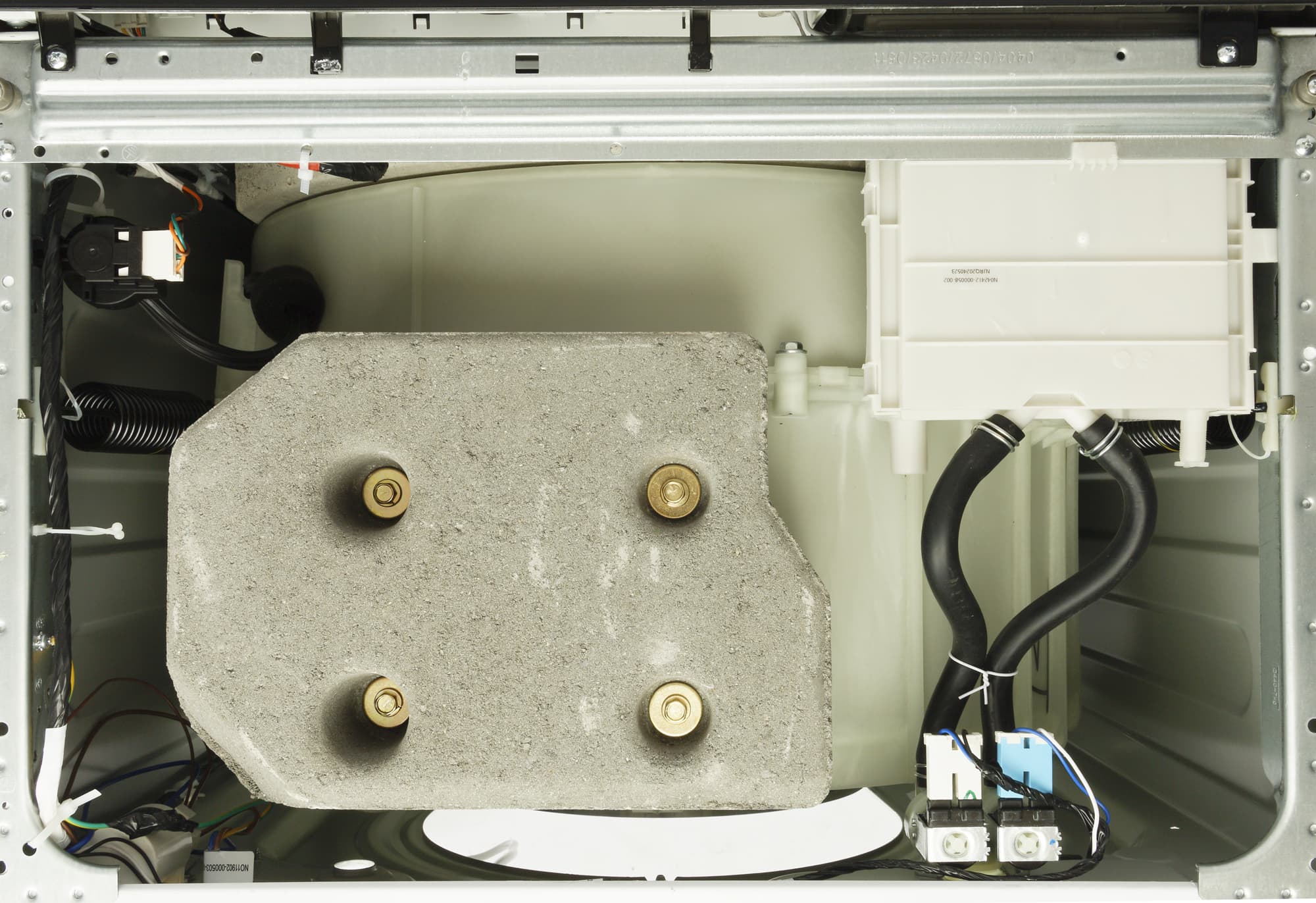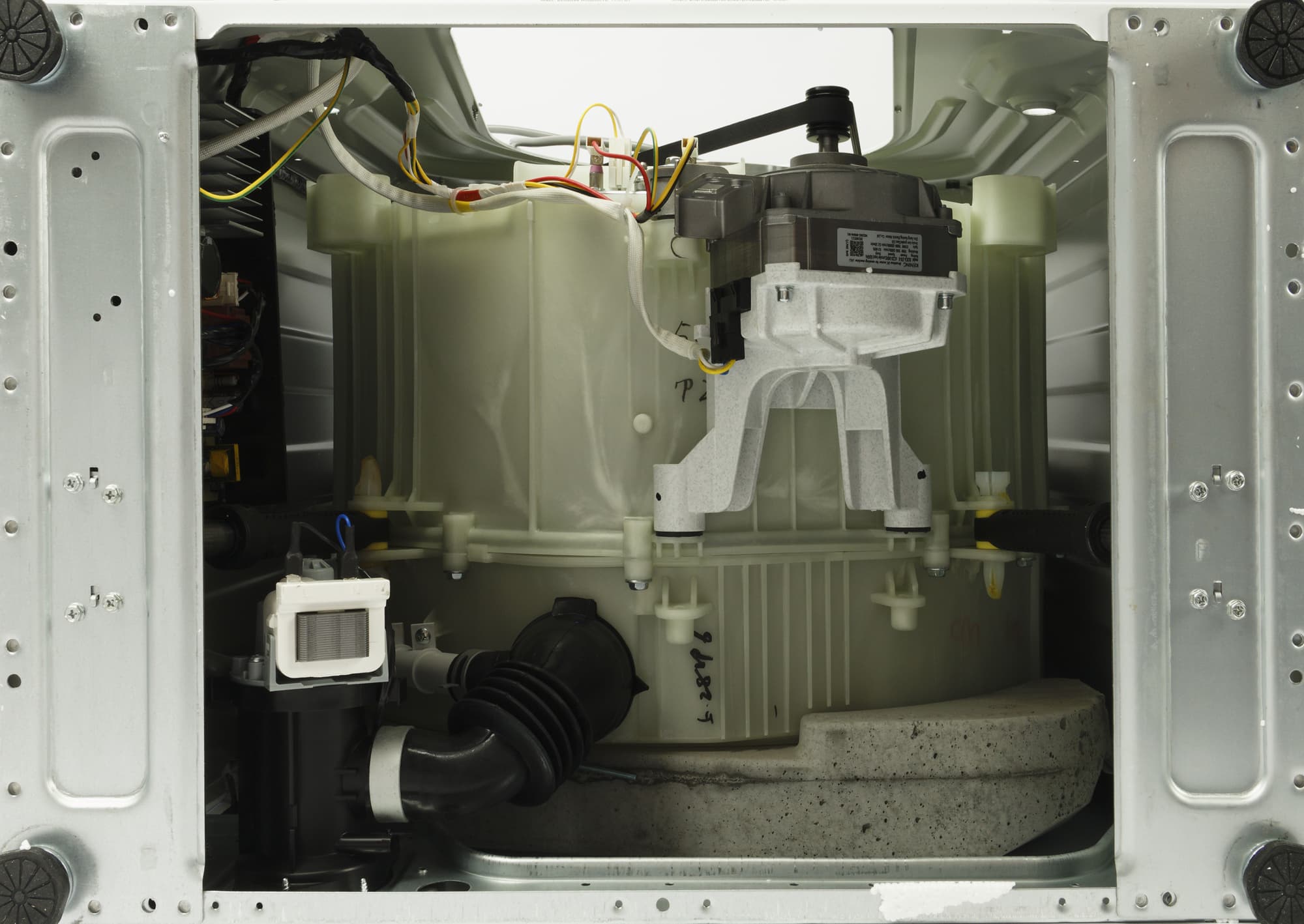 При знакомстве с новой стиральной машиной мы, как обычно, проводим ее неполную разборку, снимая верхнюю пластиковую панель и заднюю крышку, и фотографируем агрегат изнутри: сверху, сзади и снизу.