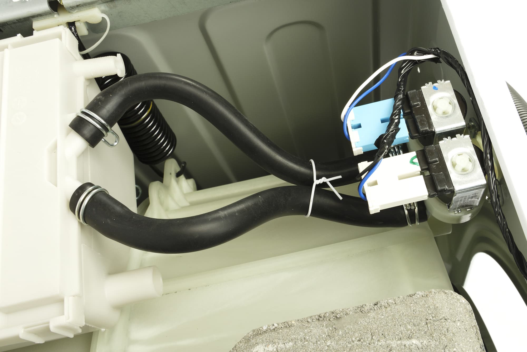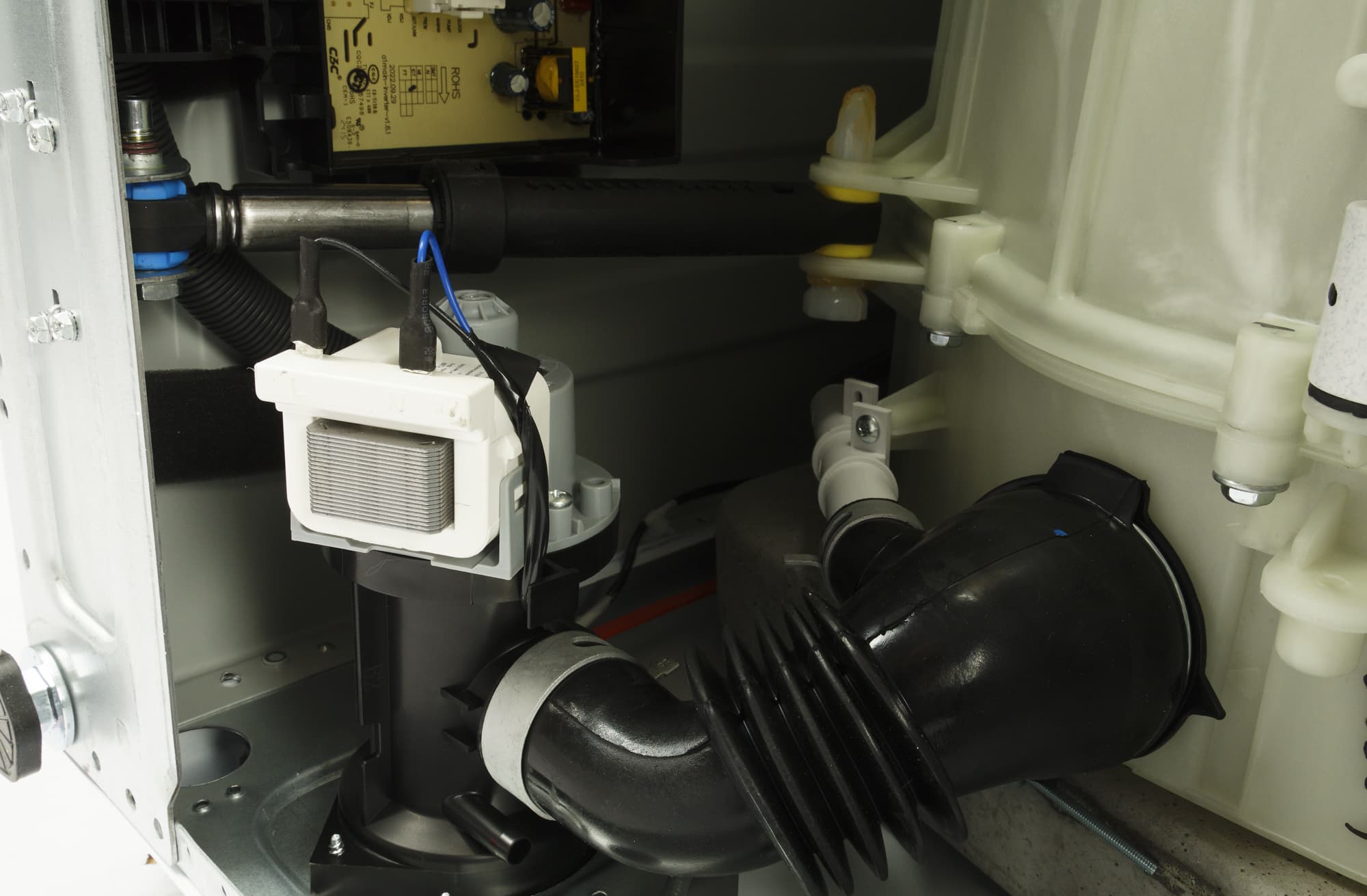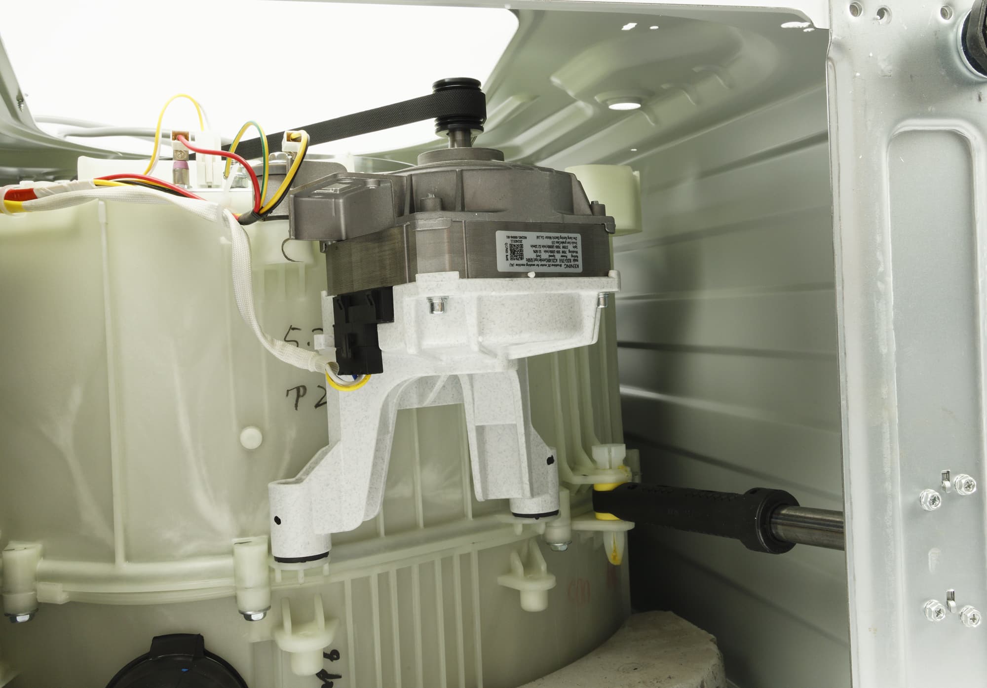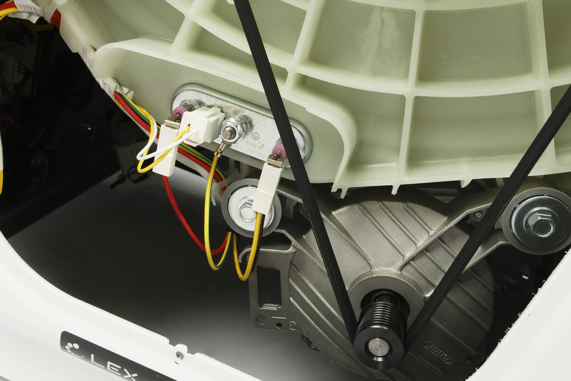 При знакомстве с новой стиральной машиной мы, как обычно, проводим ее неполную разборку, снимая верхнюю пластиковую панель и заднюю крышку, и фотографируем агрегат изнутри: сверху, сзади и снизу.
