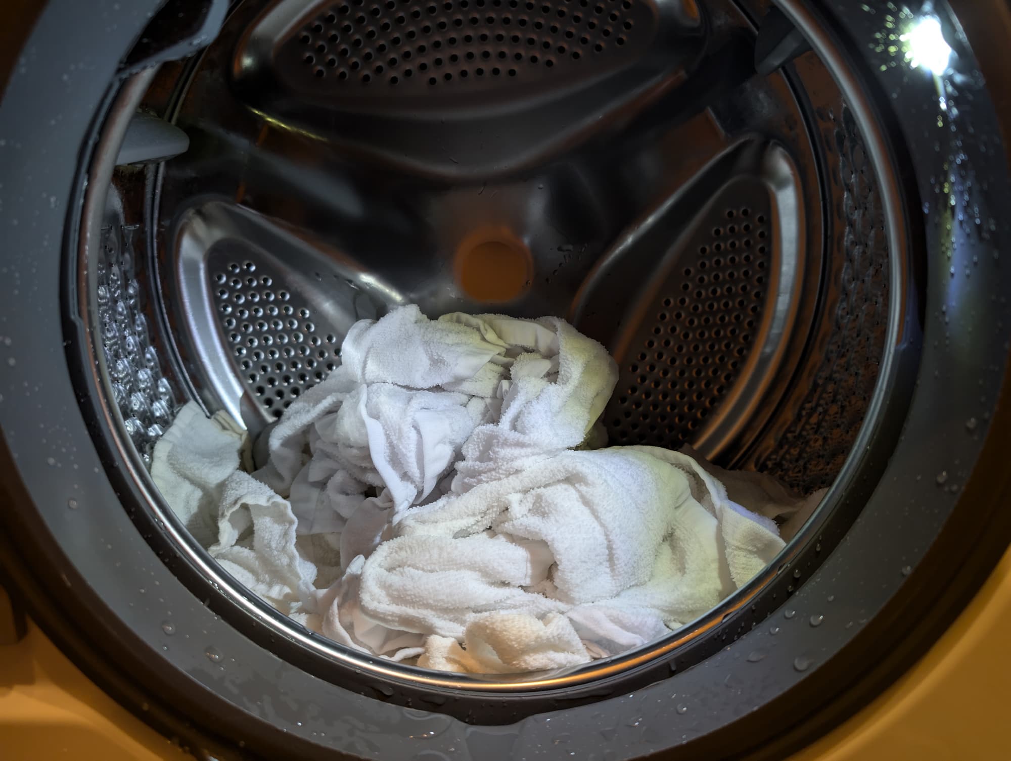 Для второго, сравнительного теста мы обычно используем ту же программу для хлопка, но с максимальной температурой, дающей существенно лучший результат. Но в этот раз решили попробовать короткую программу для интенсивной стирки.