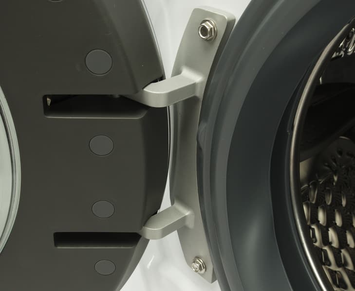 Крышка барабана двухслойная: и внутренняя, и наружная половины стеклянные. Последнее обстоятельство нас приятно удивило: фронтальную часть люка большинство производителей предпочитают делать из пластика, а темное стекло, как у этой модели, встречается крайне редко. Такое исполнение позволит надолго сохранить привлекательный внешний вид.