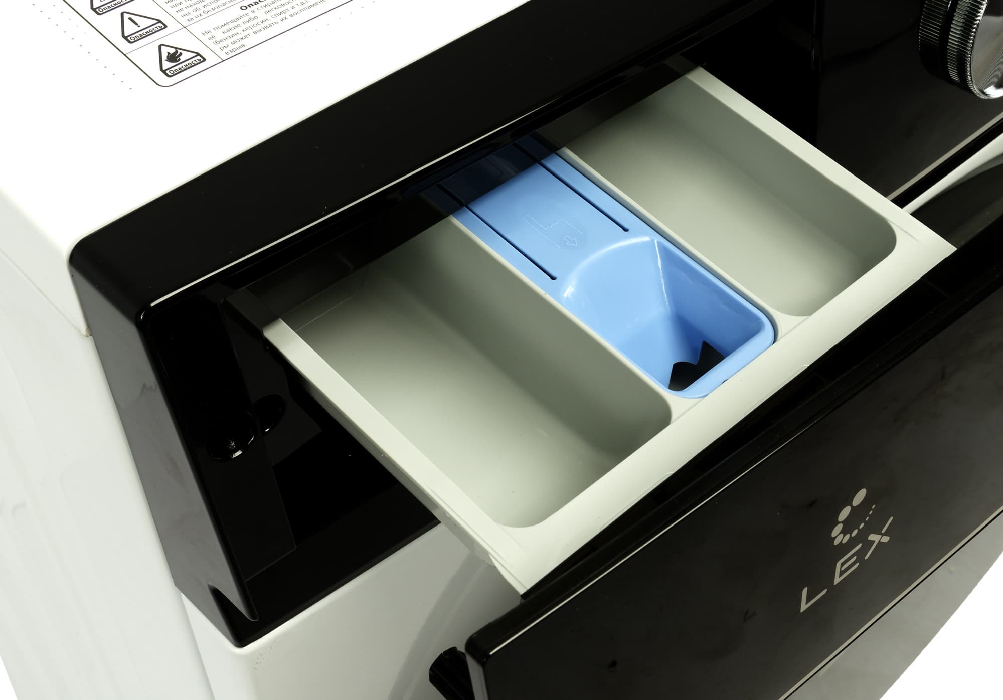 У отсека для моющих средств классическая конструкция: слева мы видим емкость для основной стирки, справа — для предварительной, а в центре расположена ванночка для кондиционера. Если лоток надо почистить, его можно вынуть, нажав на голубую защелку.