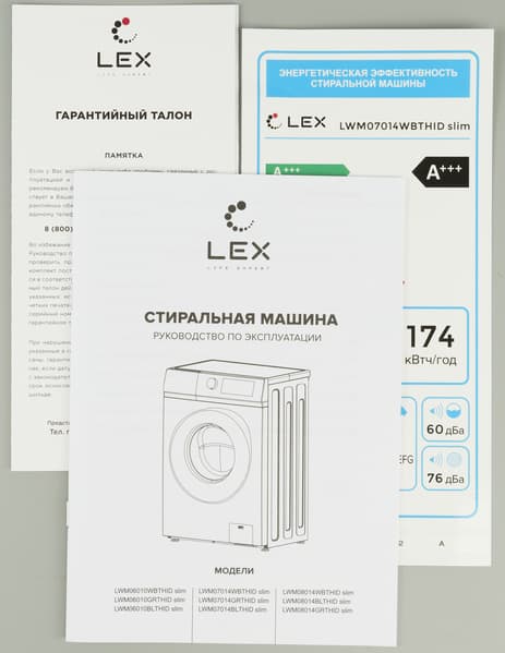 Упаковка из картона и пенопласта, в которой поставляется Lex LWM07014WBTHID, не содержит никакой значимой для пользователя информации: мы видим только логотип производителя, схематические изображения абстрактной стиральной машины, контактные данные изготовителя и транспортировочные инструкции. Индекс модели и серийный номер приведены на небольшой бумажной наклейке.