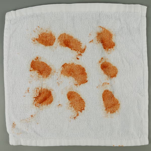 Как обычно, мы взяли красное вино, кетчуп, соевый соус и какао. Эти продукты мы нанесли на белые махровые салфетки из хлопка и выдержали ткань с разными «рисунками» в течение суток, чтобы пятна высохли и задача стала потруднее.