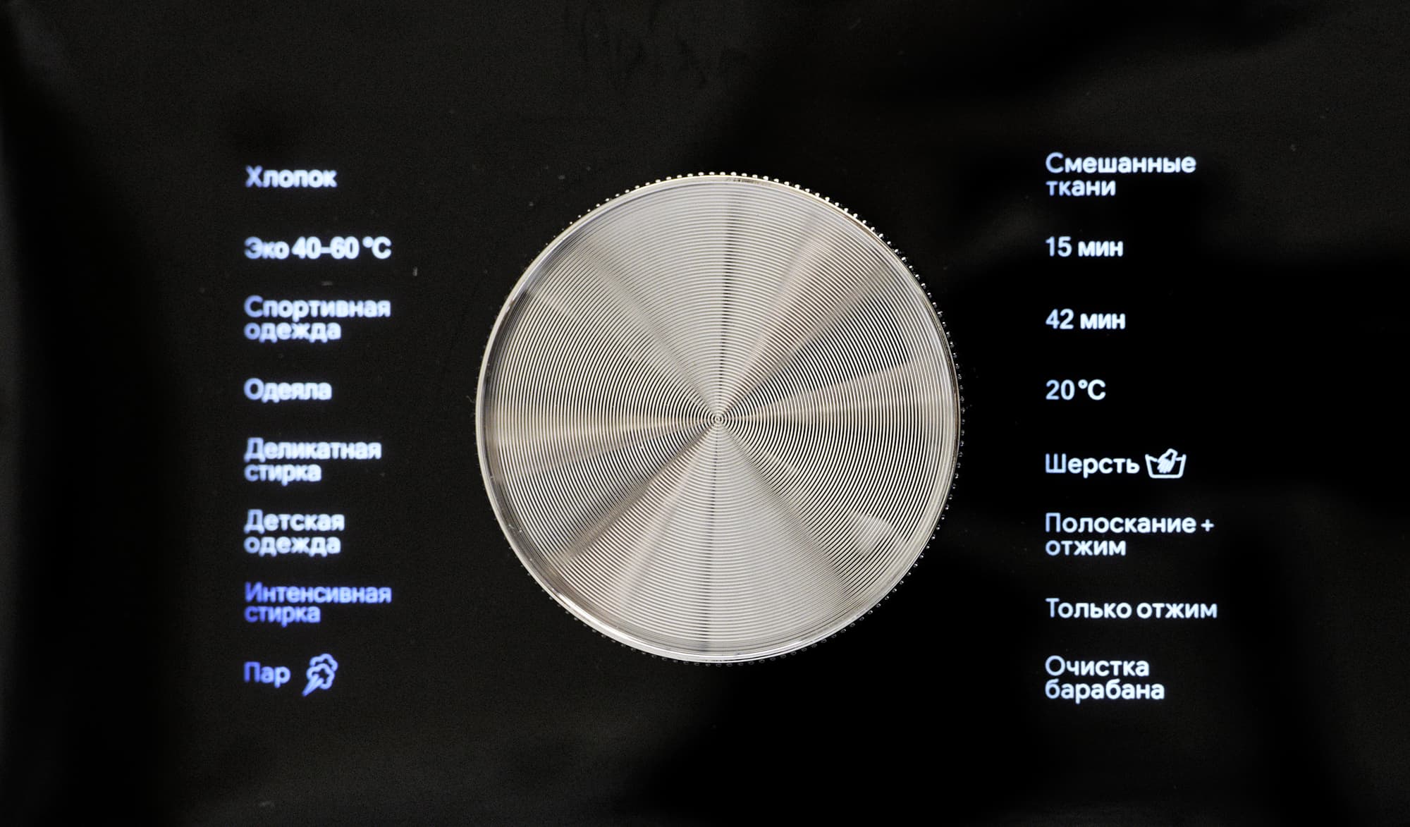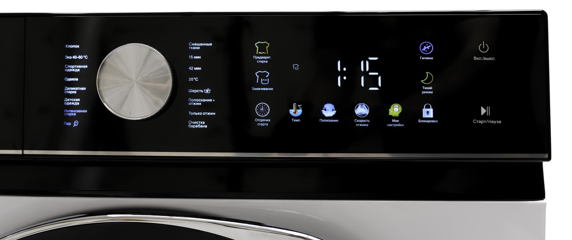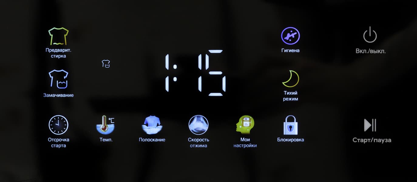 Вокруг дисплея расположены сенсорные кнопки, управляющие опциями стирки: